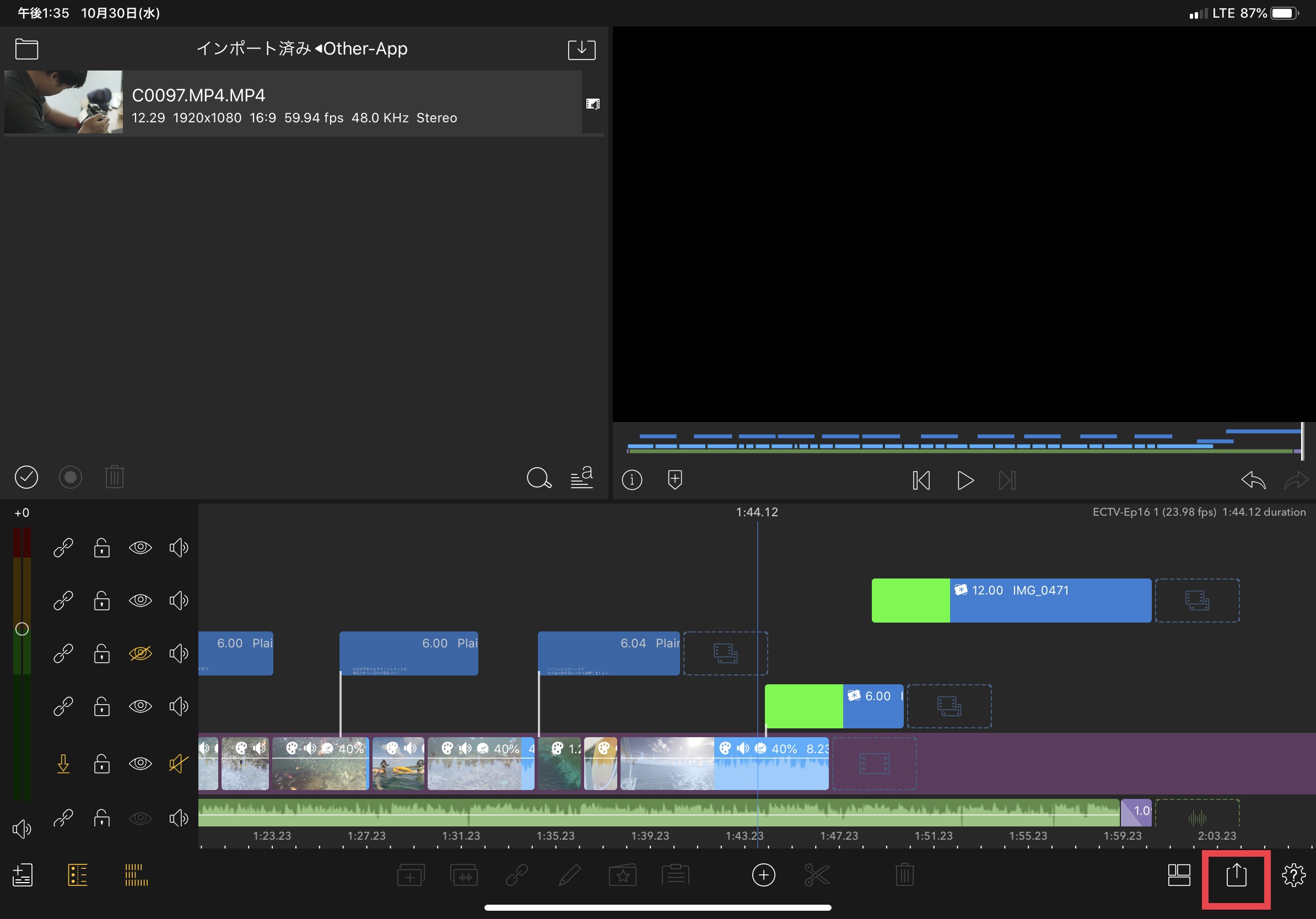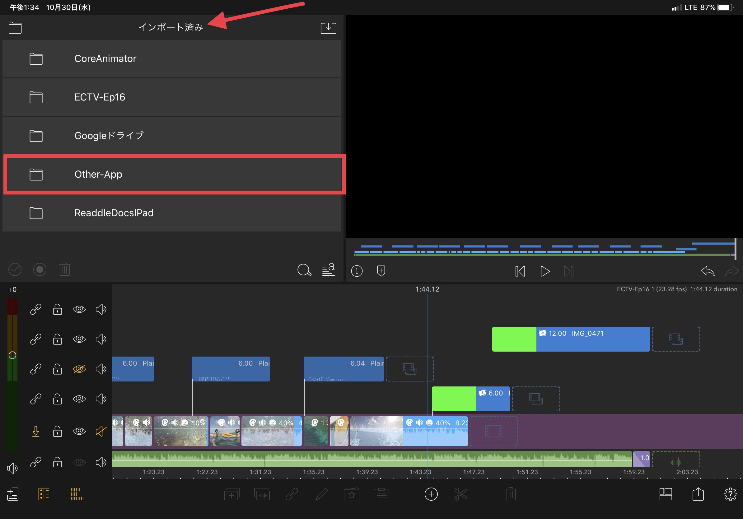 ちなみに読み込んだファイルはLumaFusion内の「インポート済み」内の「Other-App」内に格納されています。
