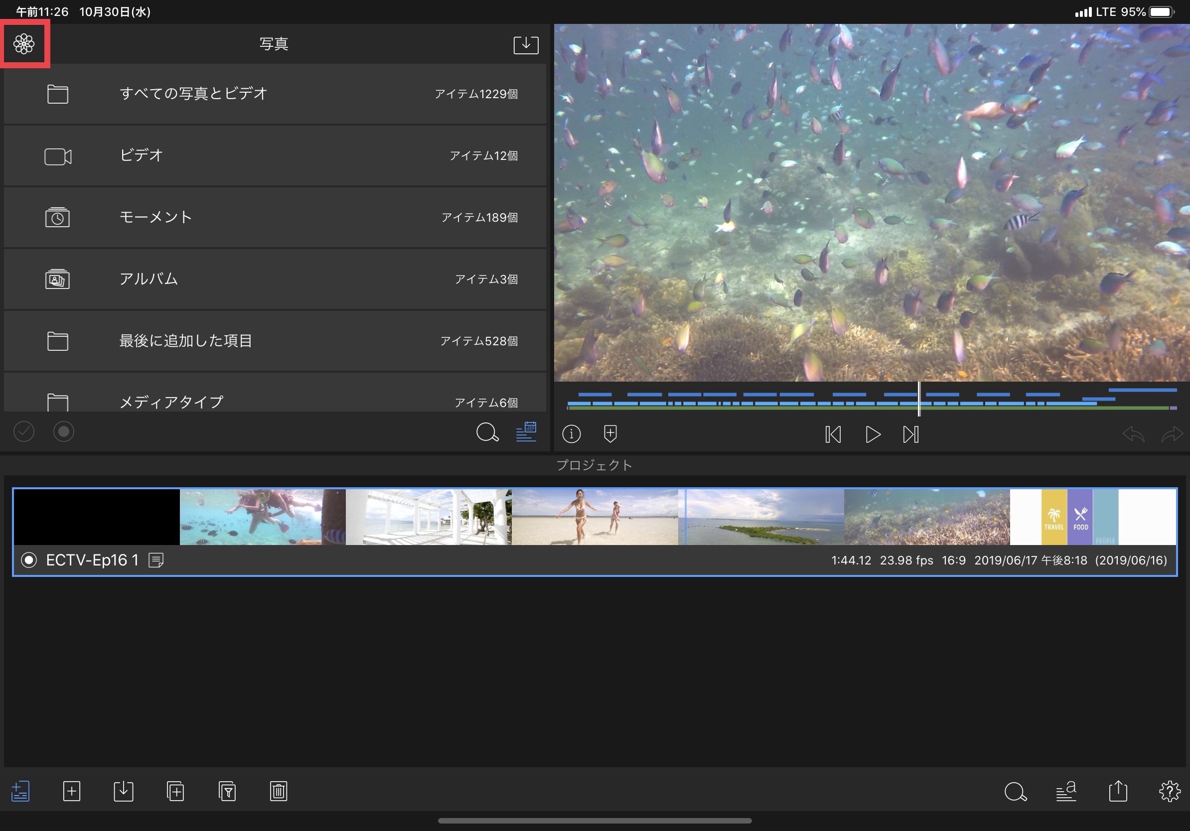「iPadで編集してみよう!LumaFusionで新規プロジェクトの作成と素材を読み込む方法」の記事で書いてある方法とほぼ同じように、アプリ左上にある写真アイコンをタップします。
