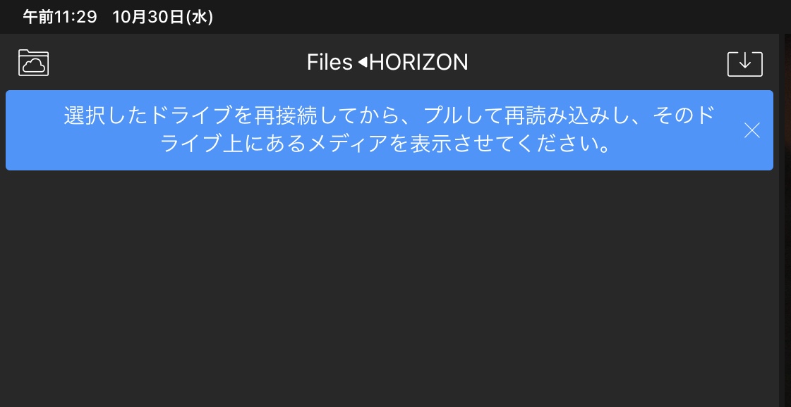 その際、読み込みウィンドウには「選択したドライブを再接続してから、プルして読み込みし、ドライブ上にあるメディアを表示させてください」と現れます。