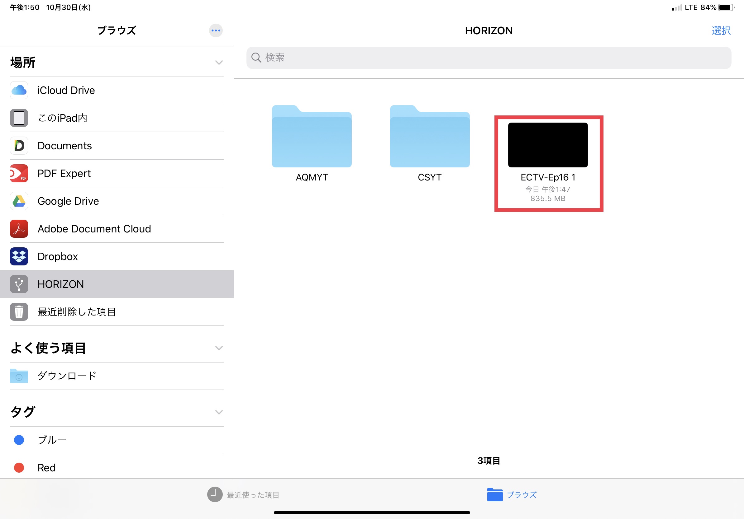 書き出したプロジェクトは下のように、しっかり外付けドライブに保存されているのが分かります。こちらも便利ですが、動画のサイズによっては転送に時間が掛かる事もあるので、注意してください。