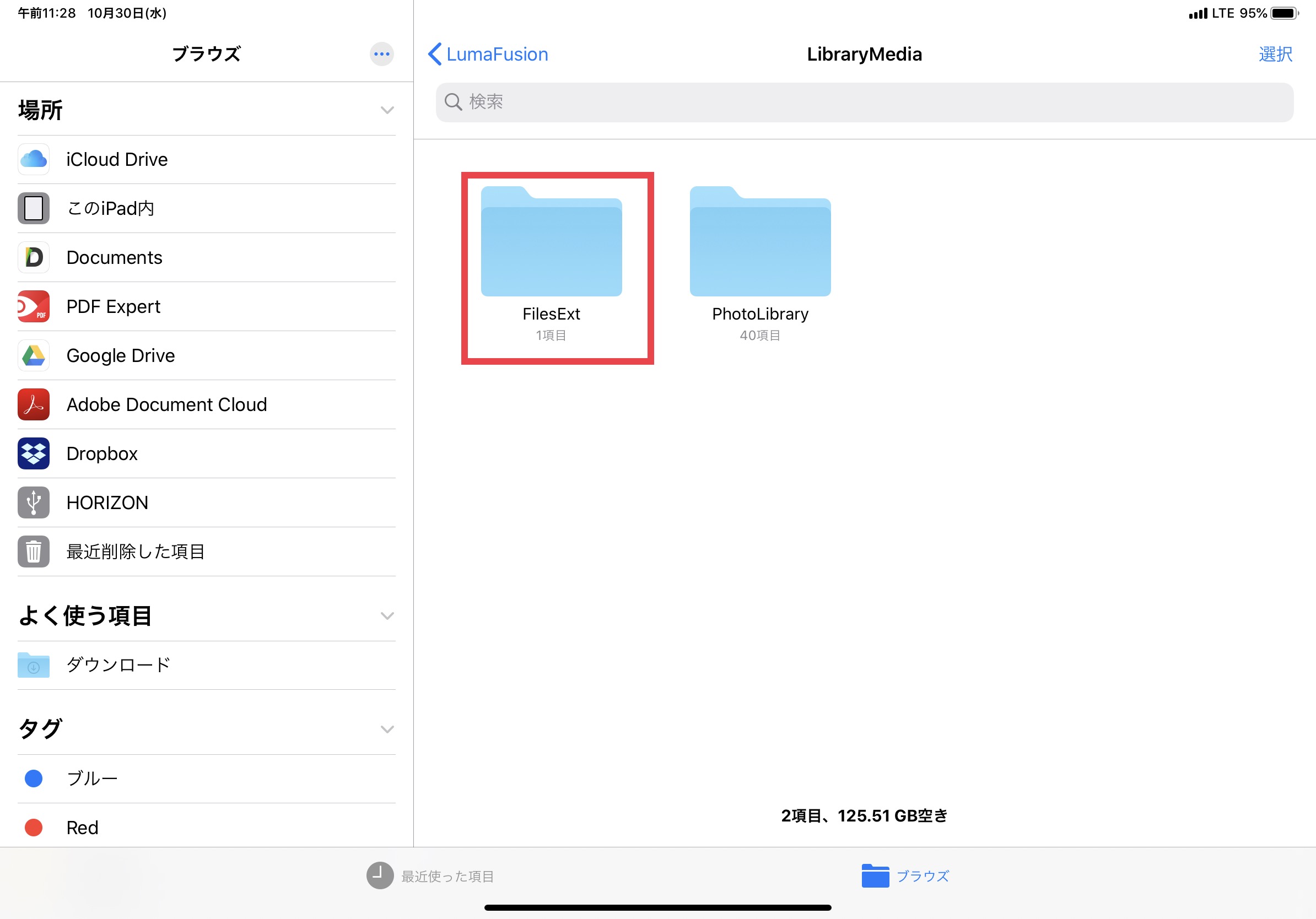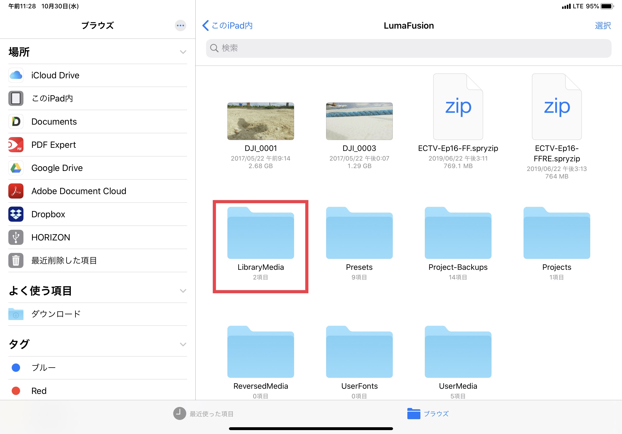 ファイルAppから確認する場合は「このiPad/iPhone内」の「LumaFusion」、「LibraryMedia」、「FilesExt」の中に保存されています。