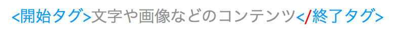HTMLの表記部分であるHTMLタグにもルールがあり、タグが開始した後は同じタグ名で終了する必要があります。これらは開始タグ、終了タグと呼ばれるのですが、一つ注意しておきたいことは終了タグには必ずスラッシュを入れる必要があるということ。