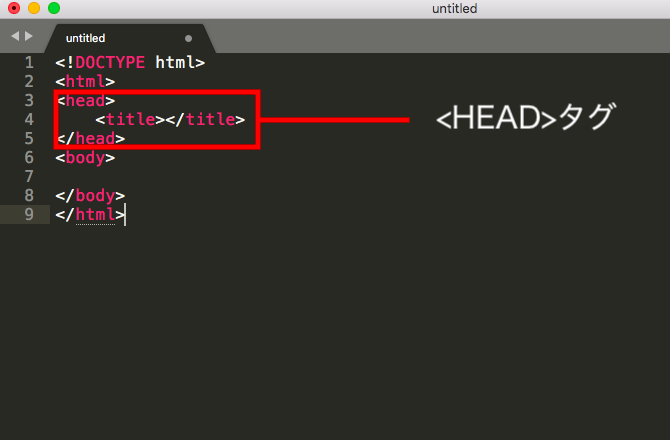 テキストエディターがあってもその文章がHTMLだと判断されないと、ウェブサイトが正確に表示または動かないことがあります。そのためウェブサイトの骨組み部分を組み立てる前に「これはHTMLだよ!」と言ってくれるDOCTYPE宣言が必要になります。<!DOCTYPE html>その後にはHTMLの全体になる<HTML>タグ、次にCSSやJavascriptなどのライブラリSEOなどの記述が含まれる<head>タグが続きます。の中にはタブに表示されるサイトのタイトルを含んだ<title>タグもあります。