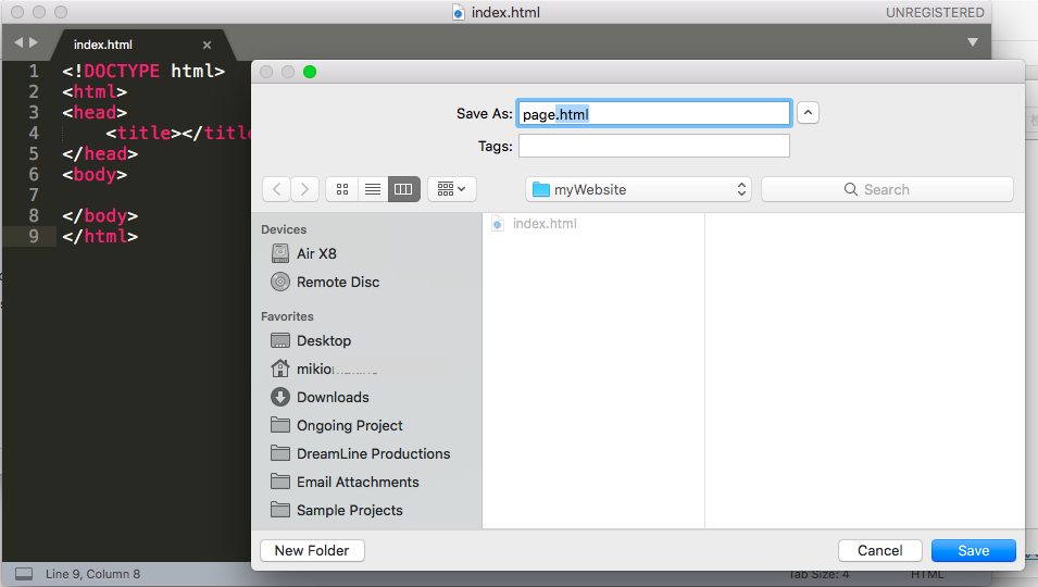 保存先はデスクトップなどでも問題ありませんが、一つのサイトを制作する時は必要になるページや画像などの素材が全てまとまっている事が理想なので、サイト名のフォルダーを作成しその中に保存しておきましょう。