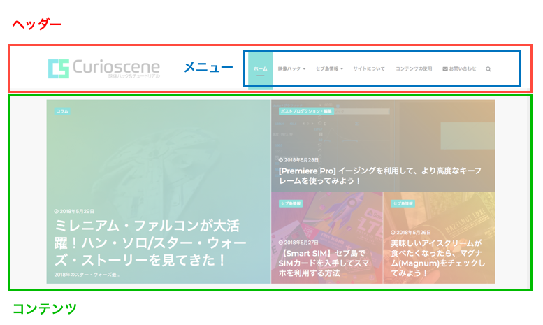 ウェブサイトの多くはサイト上部にあるヘッダー、メニューそしてコンテンツ、サイドバーなどによって構成されていますが、これらパーツをくっつけて骨組みの役割を果たしているのがHTMLになります。