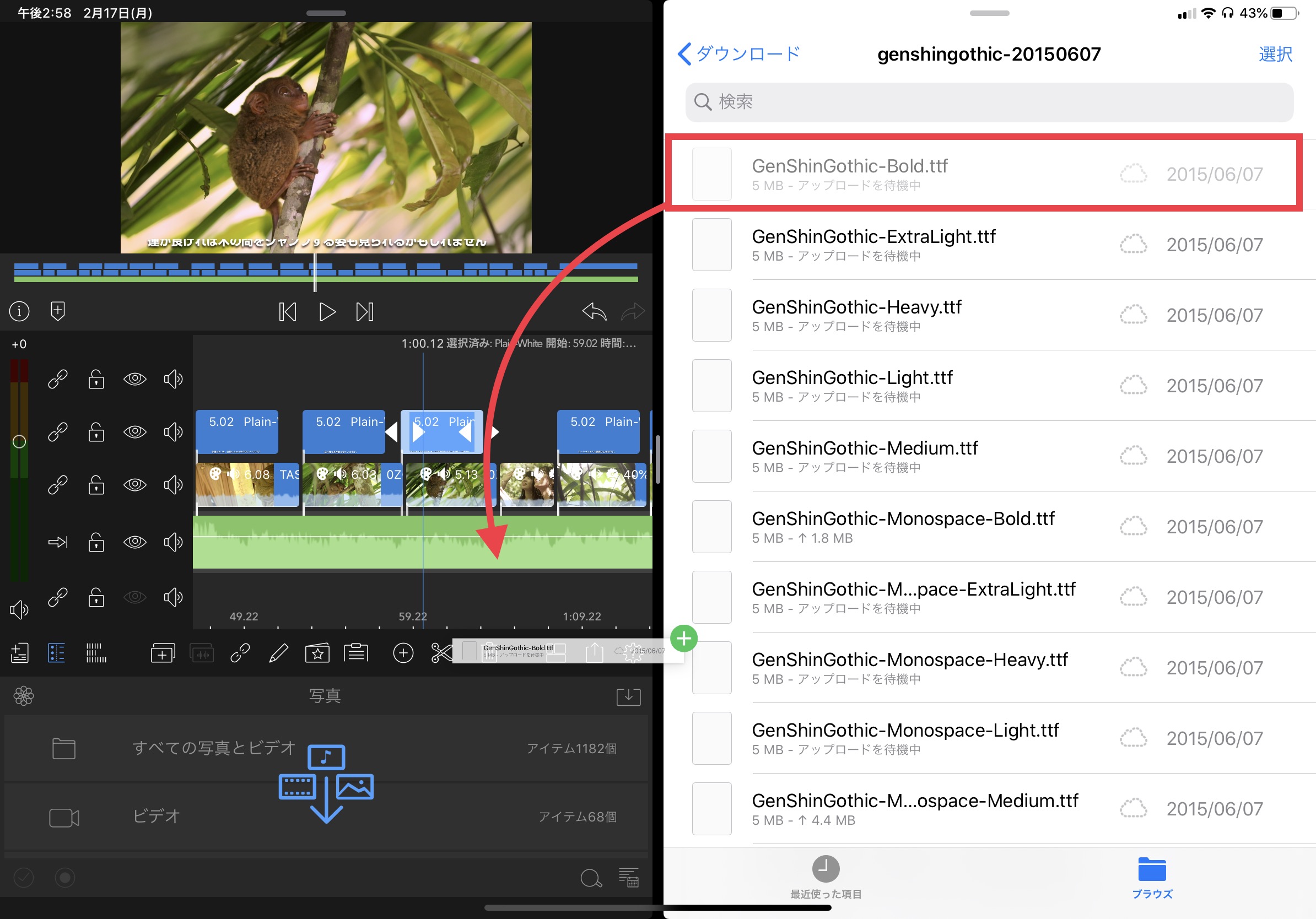 フォントをLumaFusionにインストールする方法は3種類あります。一つ目はファイルAppにあるフォントをLumaFusionにドラッグ・アンド・ドロップする方法。