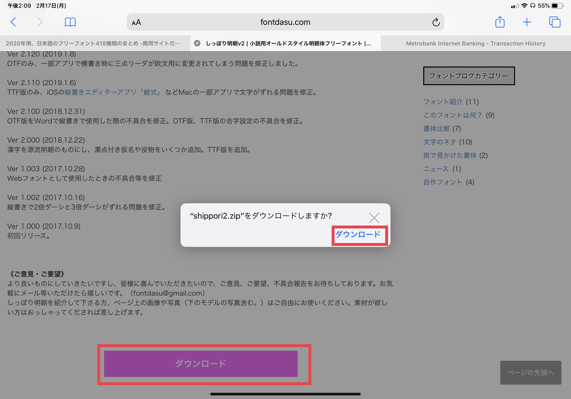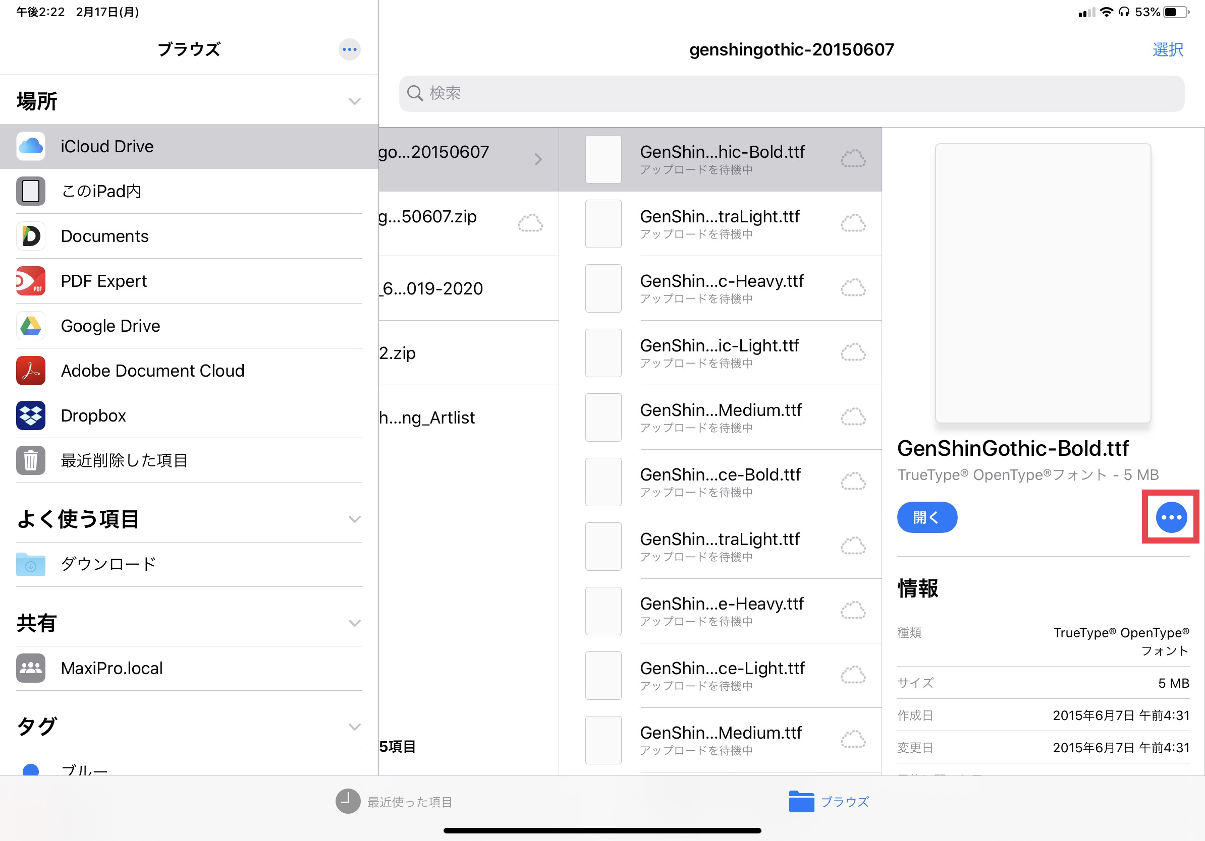 各ウェブサイトにあるダウンロードリンクからZIPファイルに圧縮されたフォントをダウンロードし、ファイルAppを使って展開します。