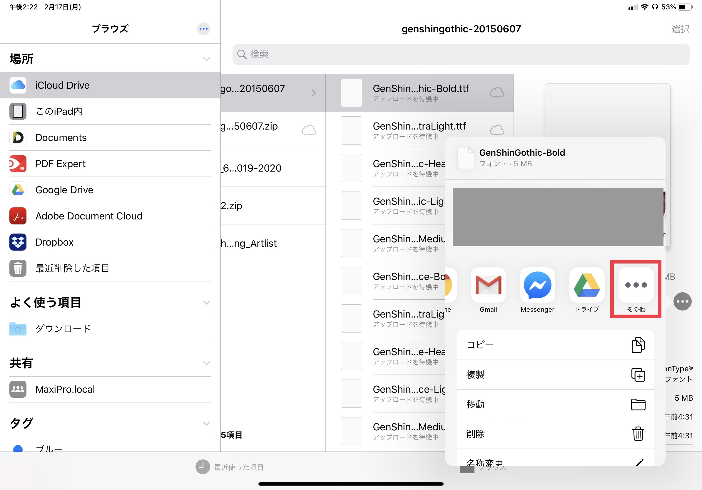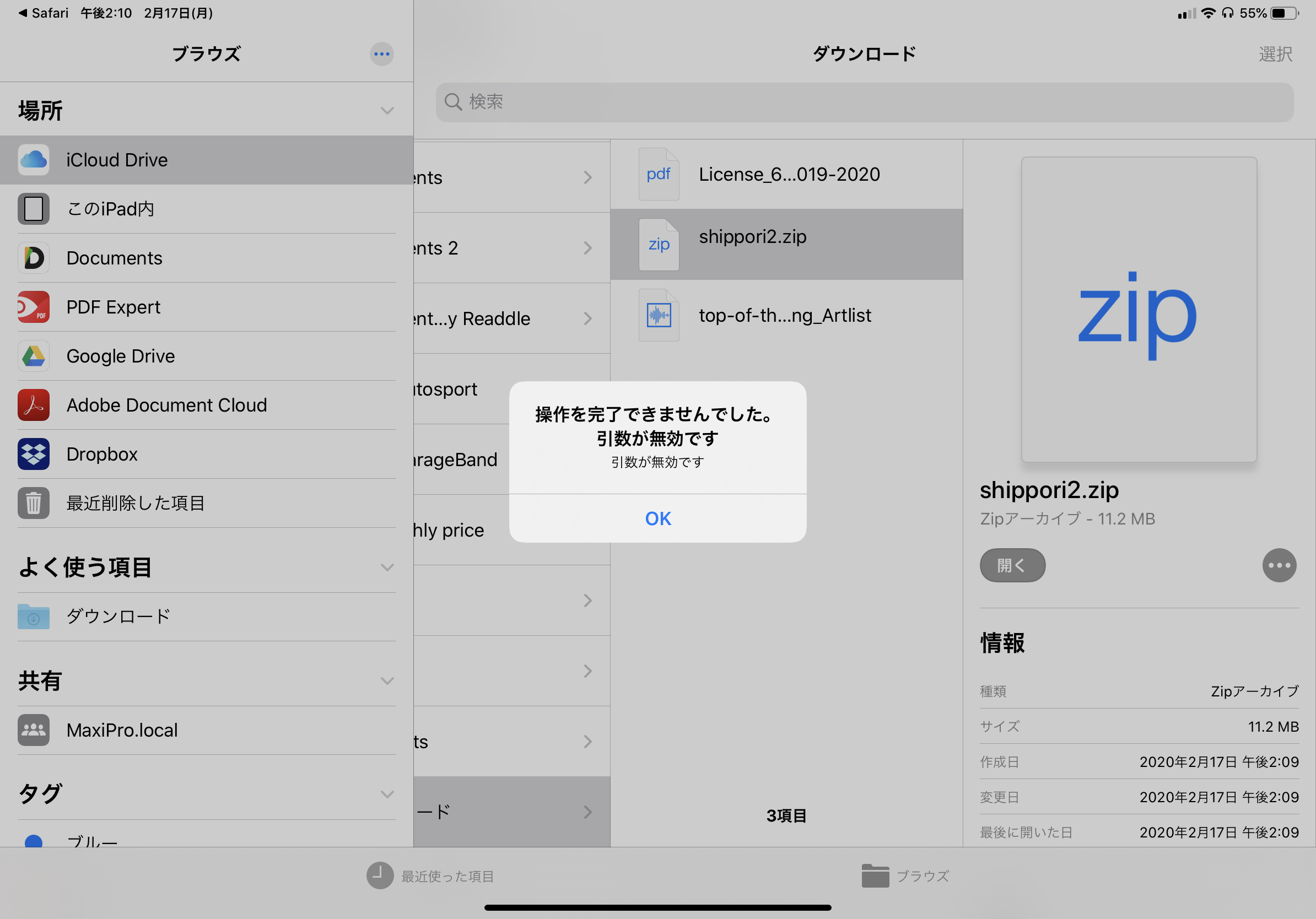 フォントサイトでダウンロードしたZIPファイルがiPadなどのファイルAppを使って展開しようとすると「操作を完了できませんでした。引数が無効です」と表示される場合があります。