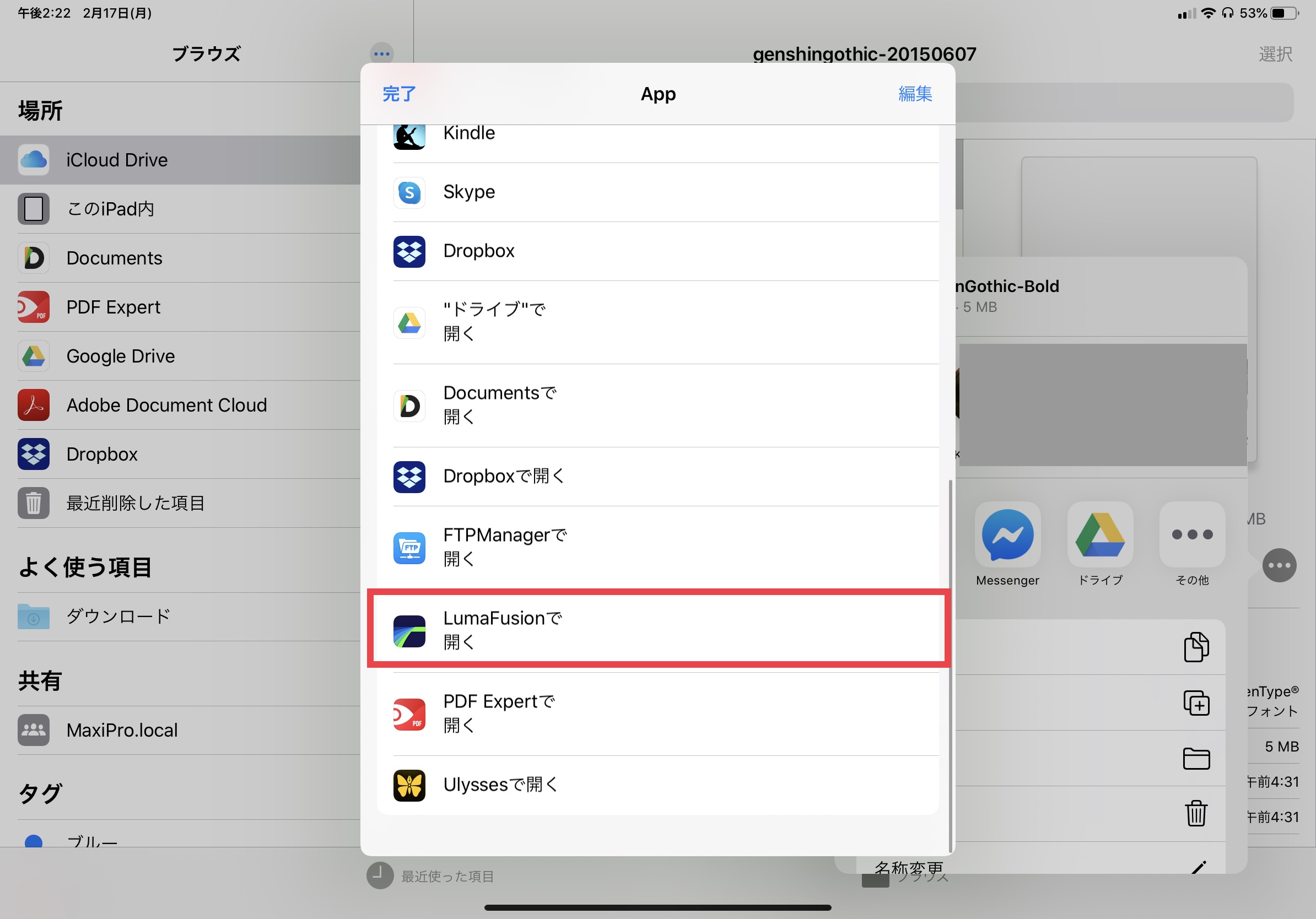 2つ目はフォントを選択して、「・・・」アイコンから「共有」、「その他」、「LumaFusion」で開くをタップします。