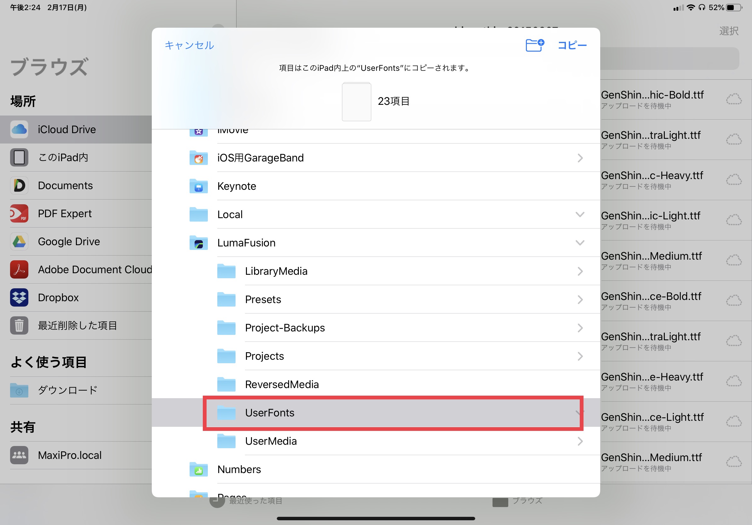 ファイルAppでインストールするフォントを全て選択し、「移動」をタップして「このiPad内/LumaFusion/UserFonts」のフォルダを選択しまして、「コピー」をタップします。