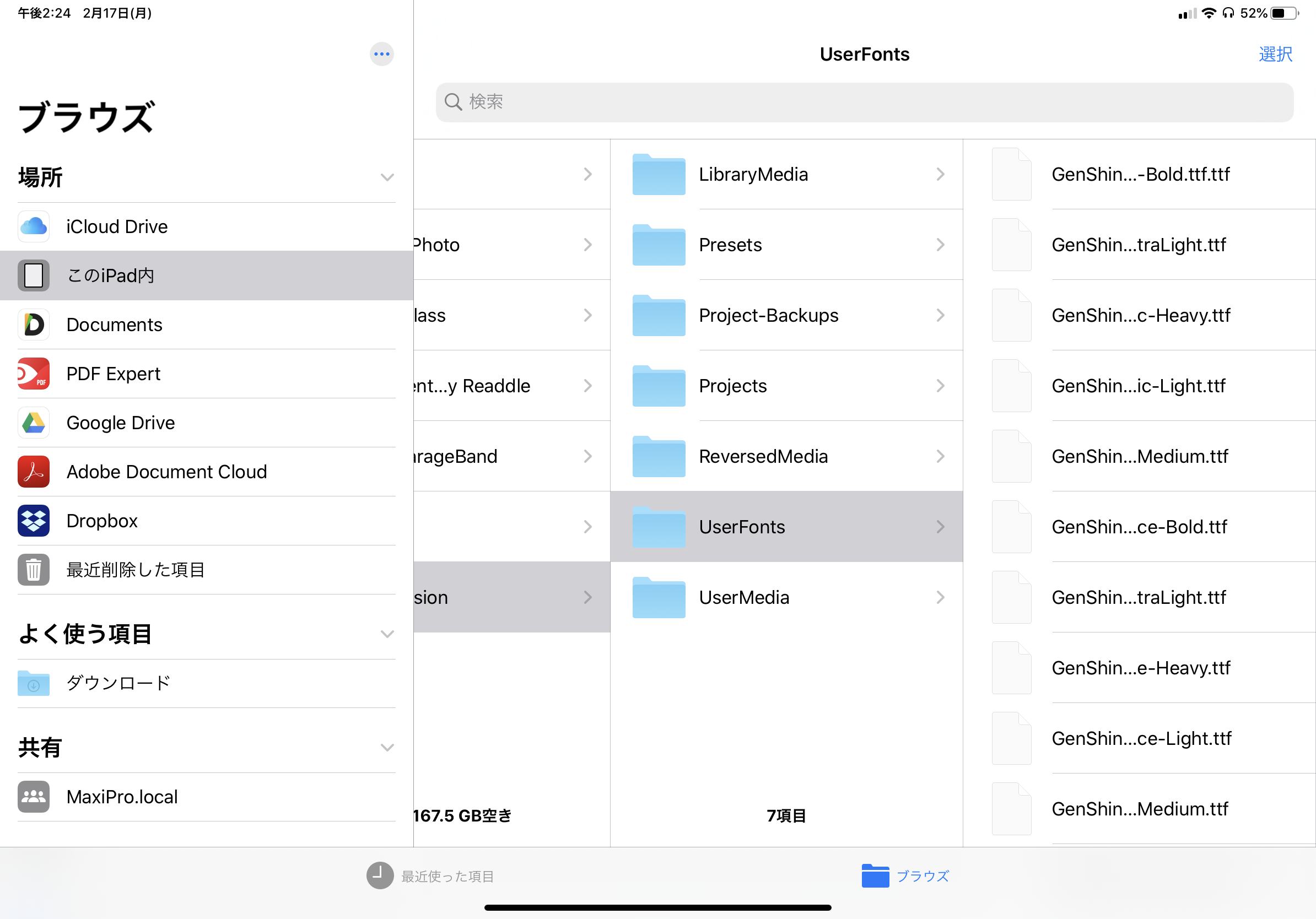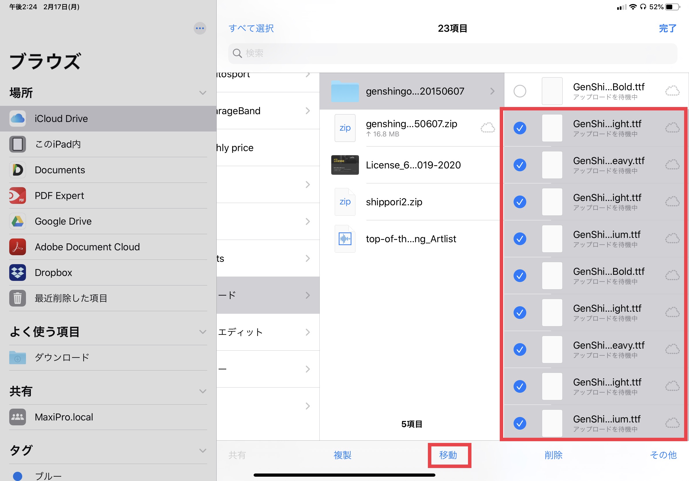 ファイルAppの「このiPad内/iZip」に展開したフォルダが表示されているので、その中にあるフォントを全て選択し、「このiPad内/LumaFusion/UserFonts」に移動させましょう。