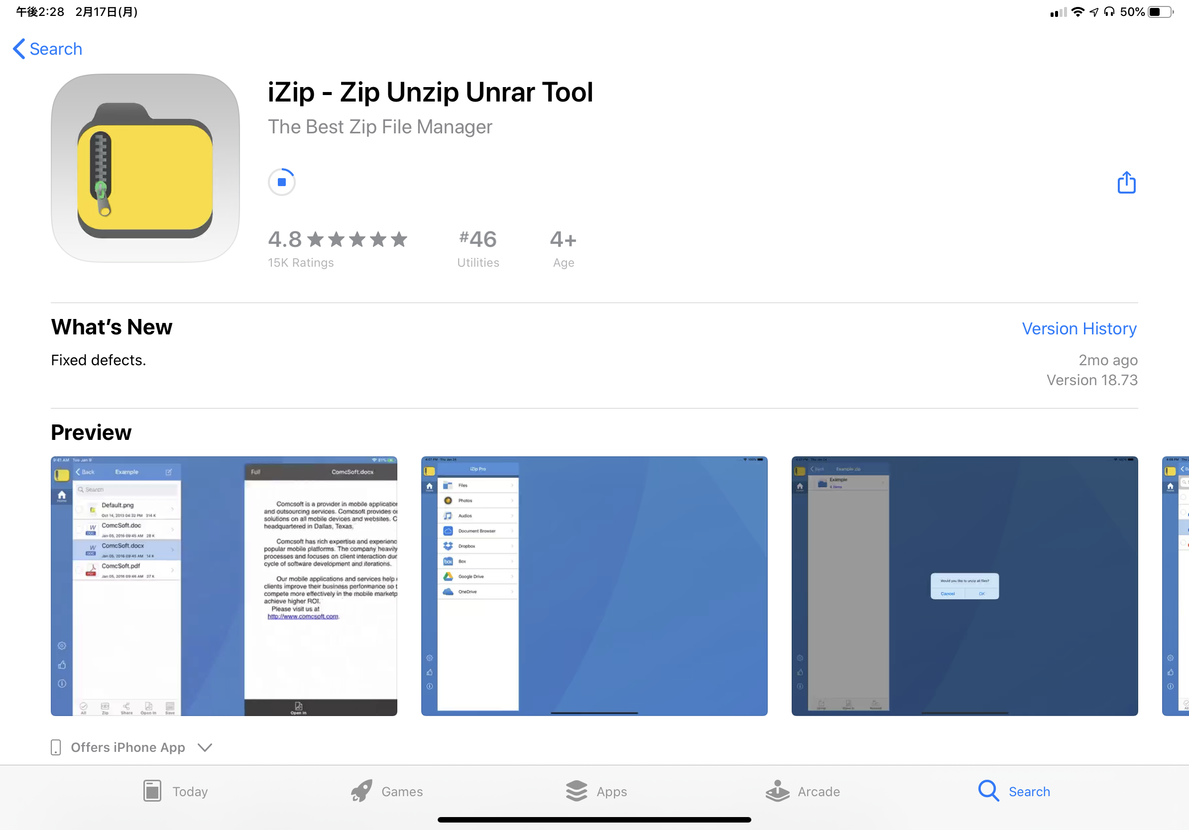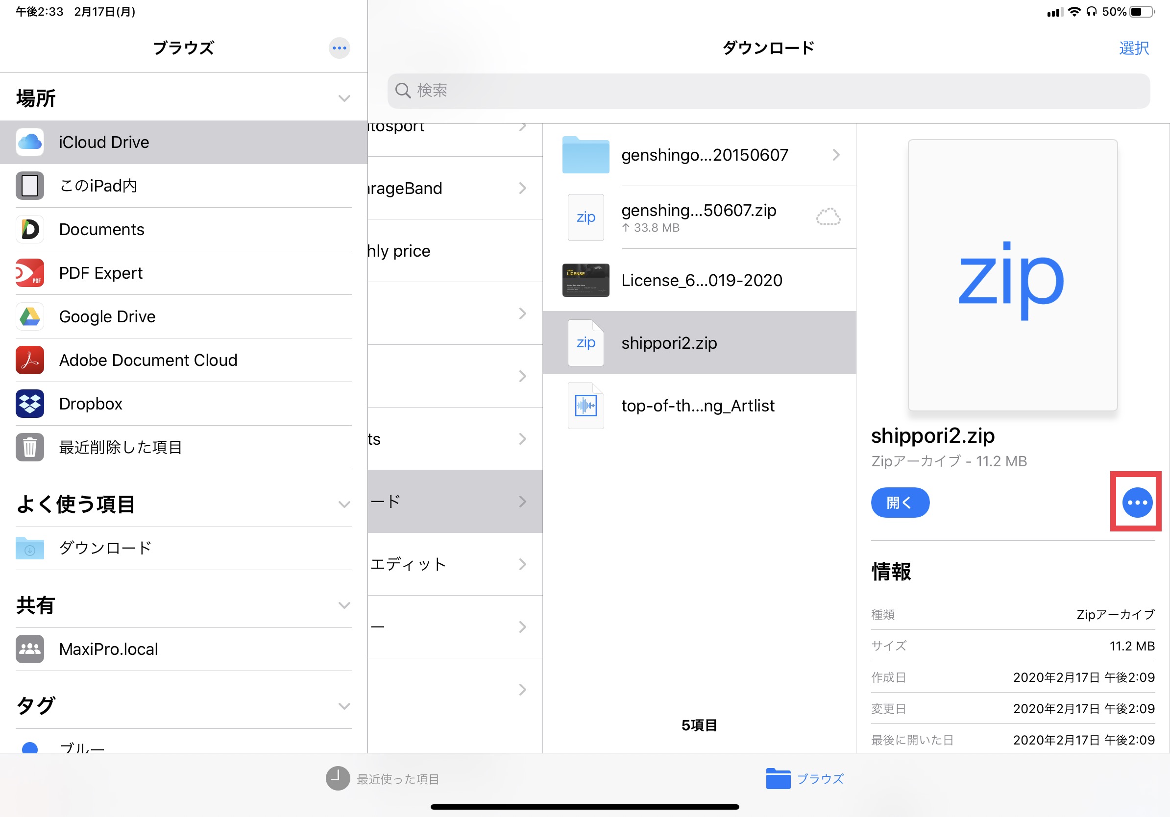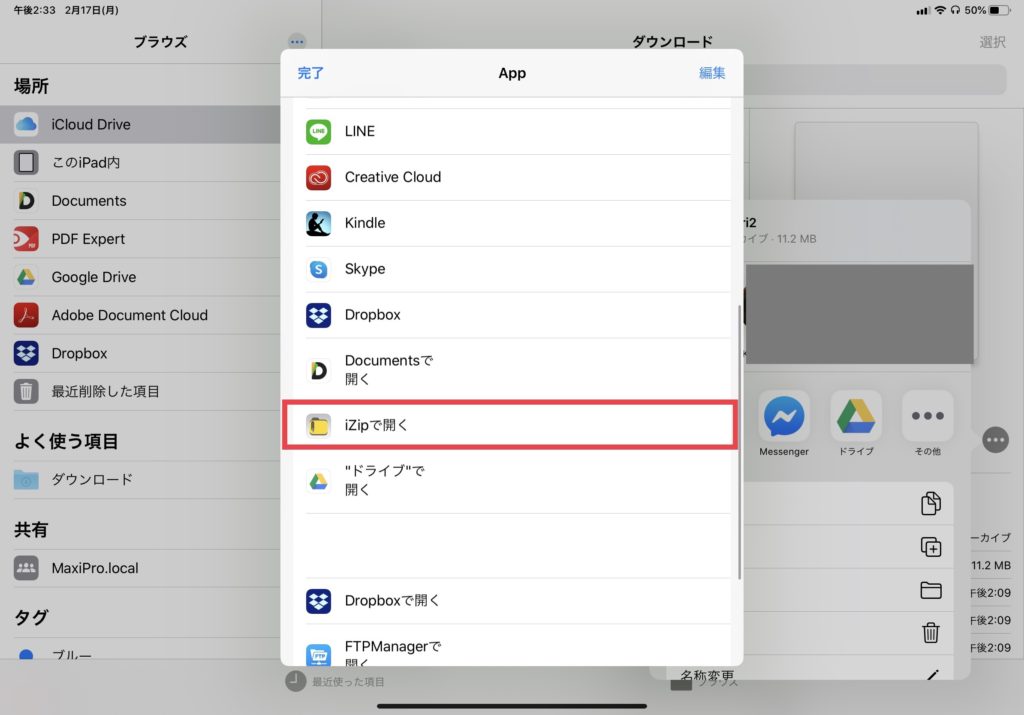 ファイルAppからダウンロードしたZIPファイルを「・・・」から「iZIPで開く」をタップします。