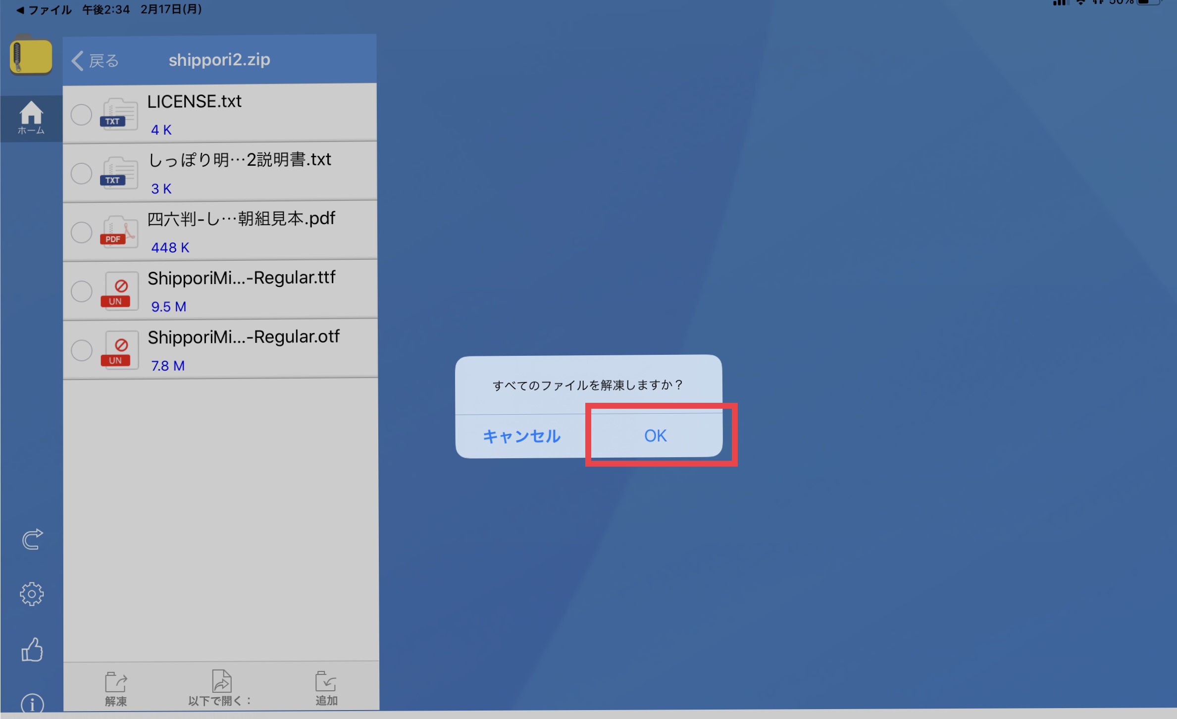 iZipが開くと「すべてのファイルを解凍しますか?」と現れるので、「OK」をタップして展開を完了させます。