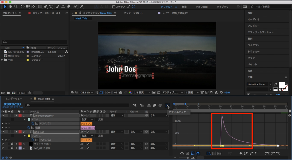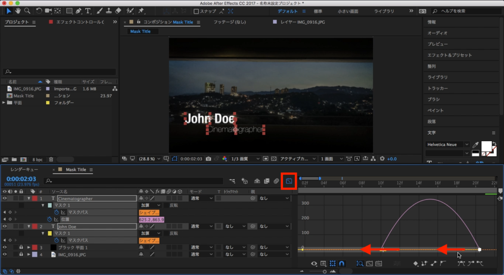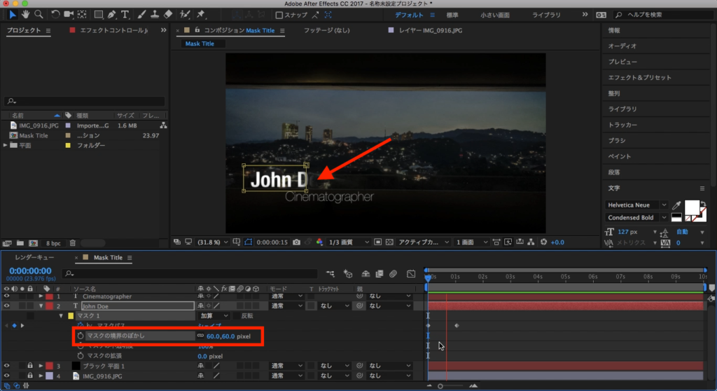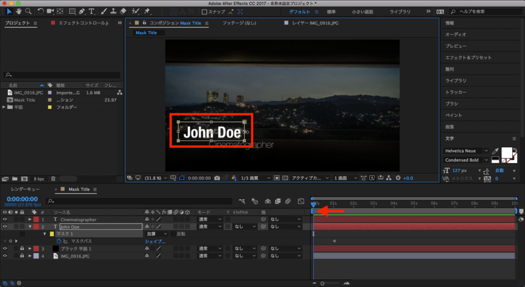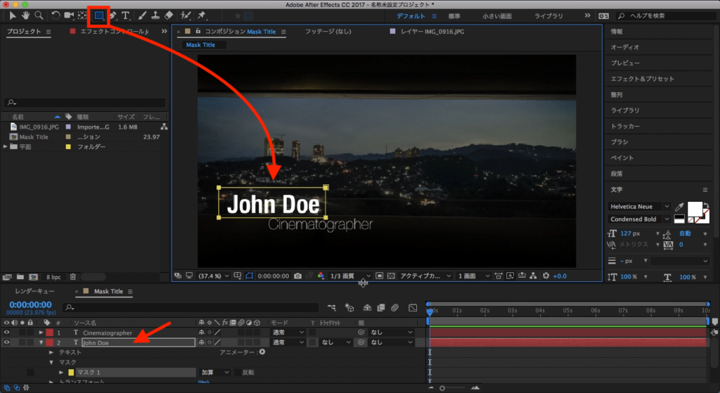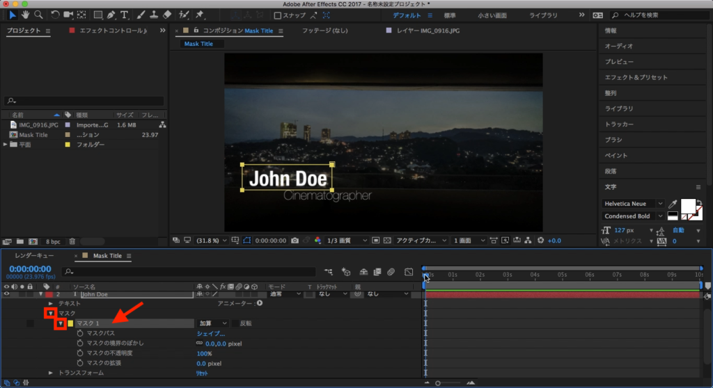 John Doeのテキストを選択して、その中にあるマスクの項目を三角形アイコンをクリックして展開させます。