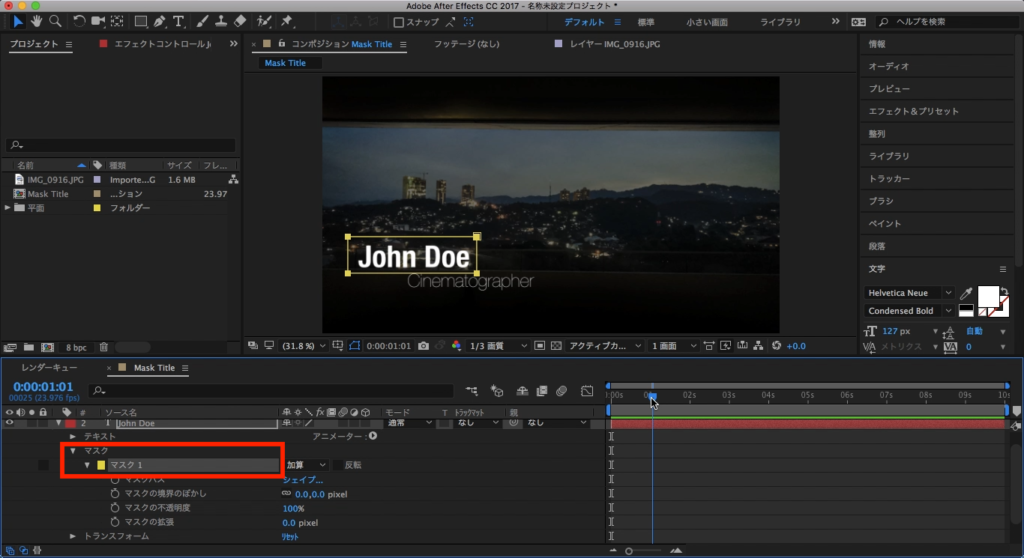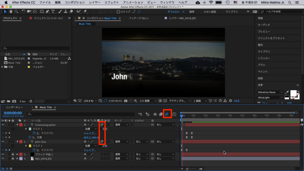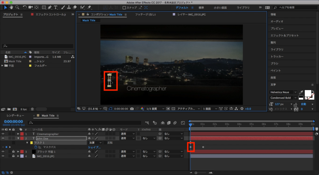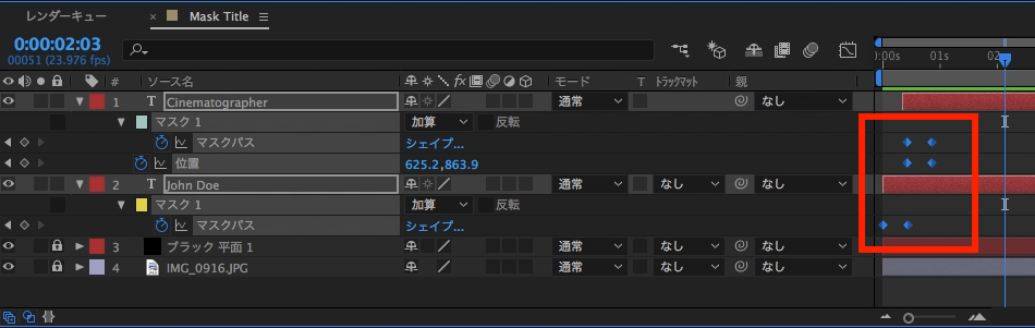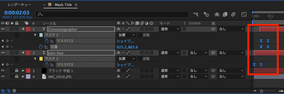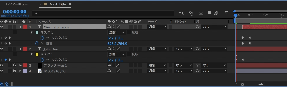 追加後はテキストレイヤーに「マスク」という項目が現れれば、マスクの追加を完了できます。もう一つのCinematographerのレイヤーにも同じ様にマスクを追加しましょう。