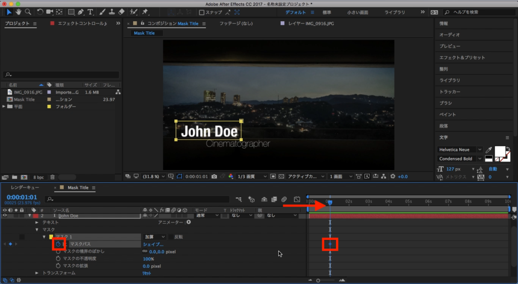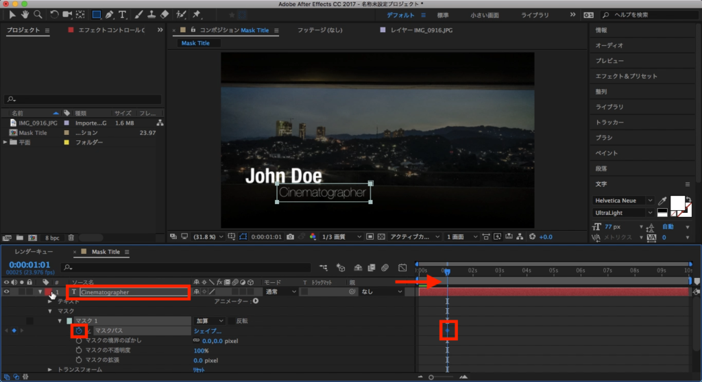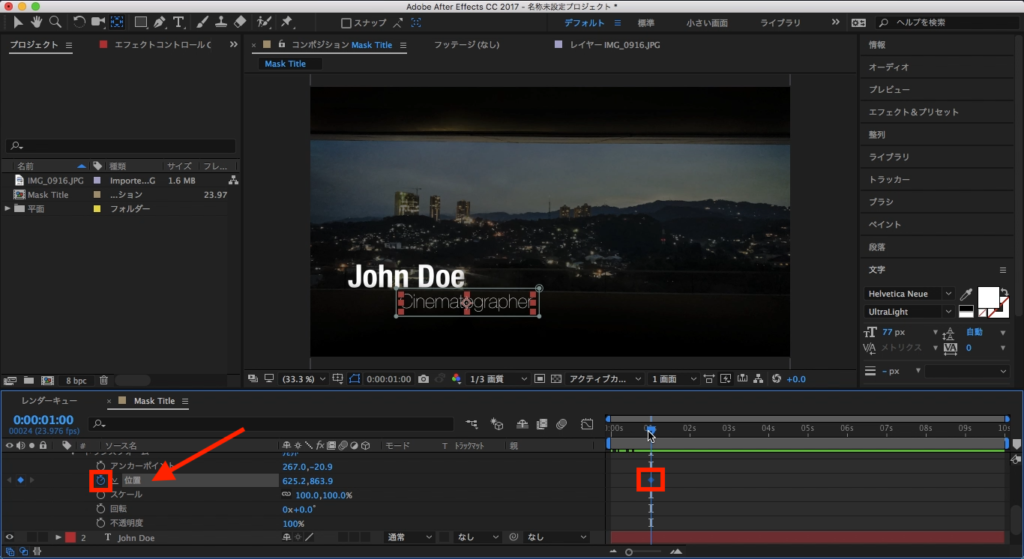 まずCinematographerのテキストレイヤーを選択し、タイムインディケーターを1秒に移動させて、マスクパスにキーフレームを追加します。