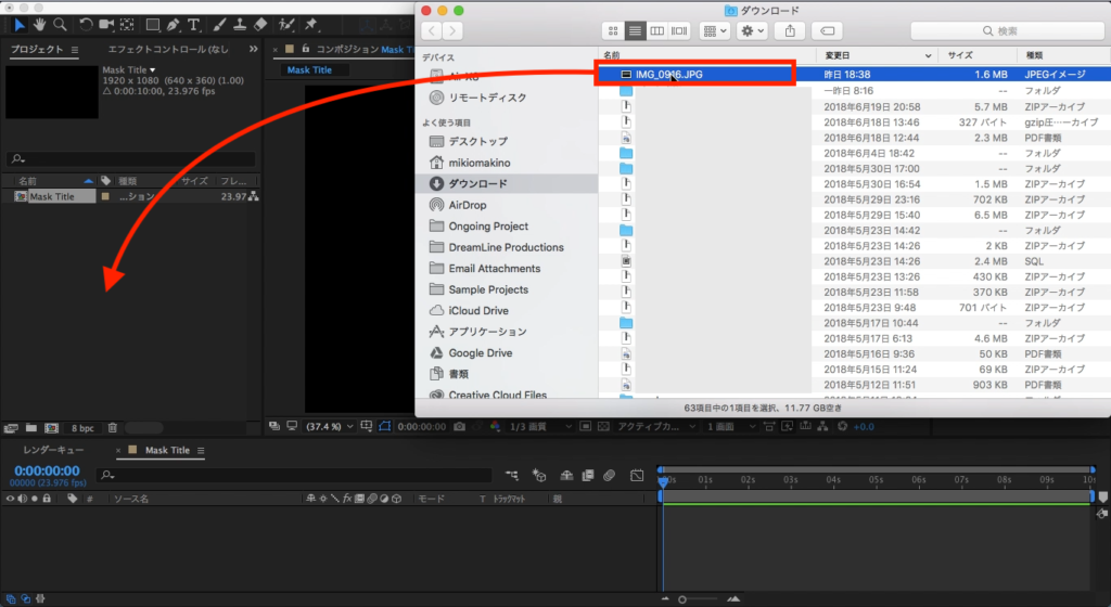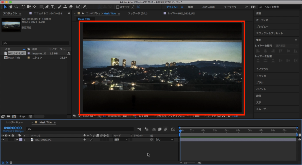 今回は映画っぽくしたいので背景には画像を使用していますが、映像素材等がある場合は好みで変えましょう。素材をプロジェクトウィンドウに追加し、そのままタイムラインまたはコンポジションにドラッグ・アンド・ドロップします。