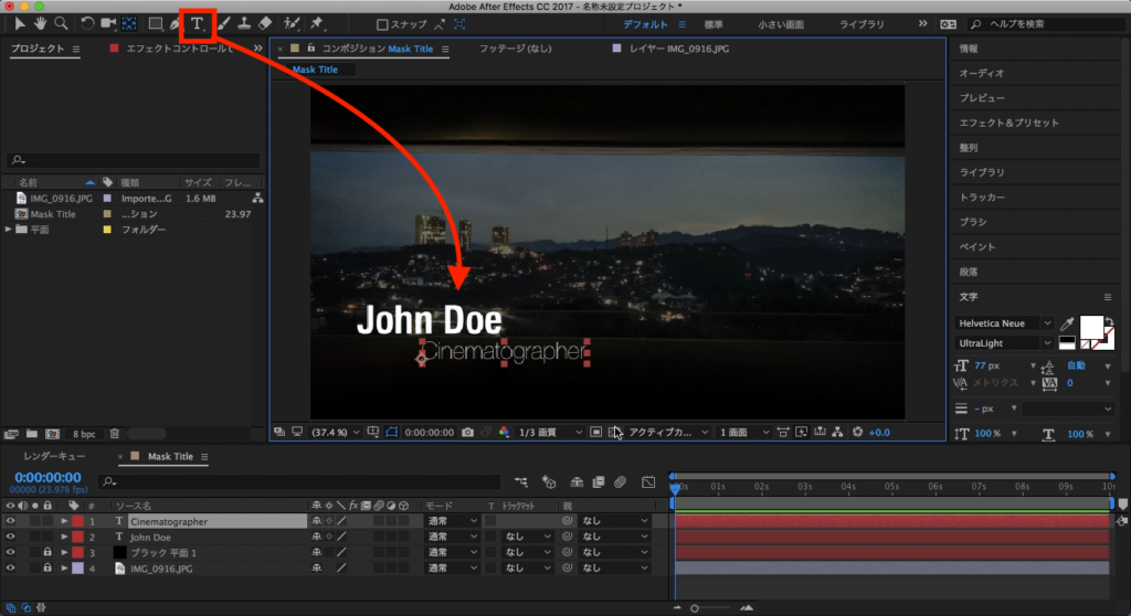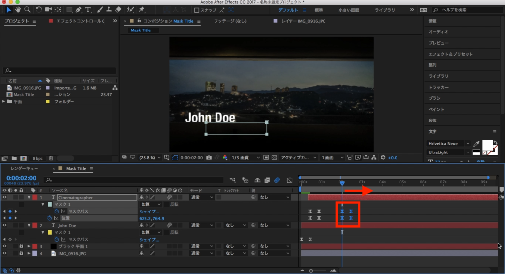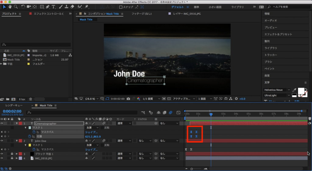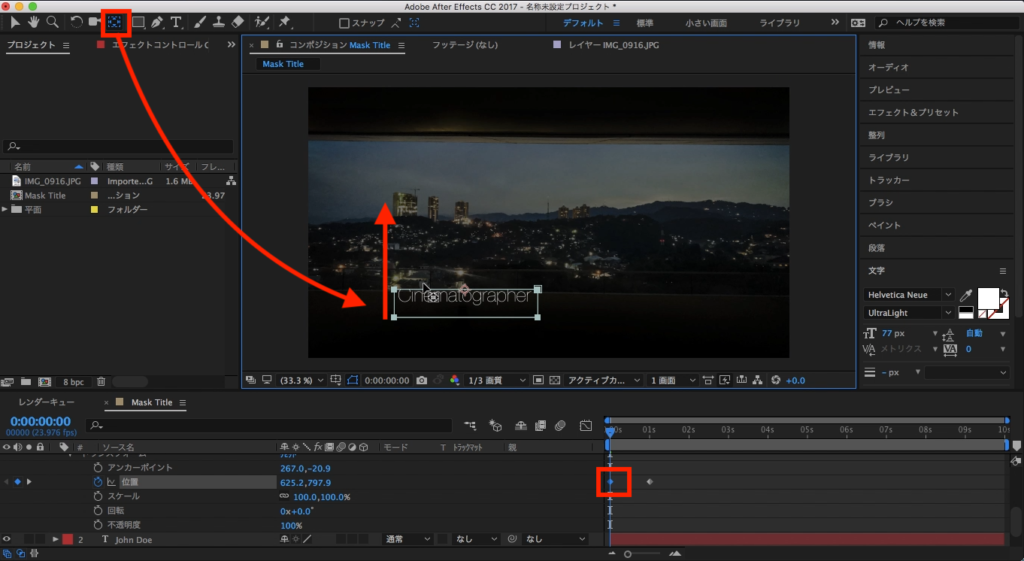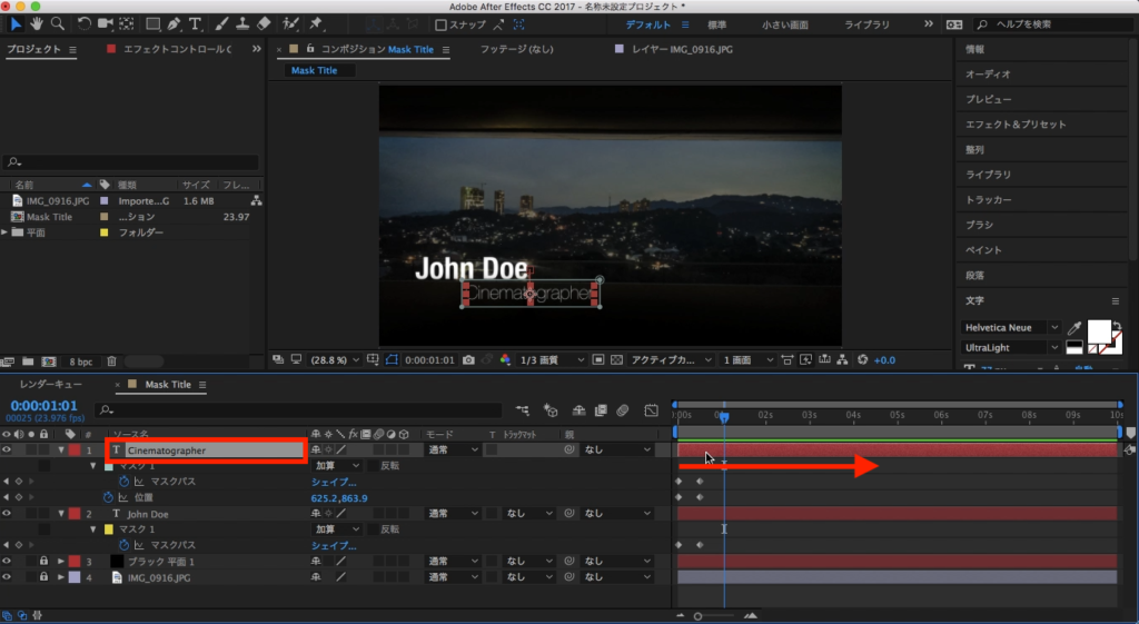 最後は2つのテキストレイヤーが現れるタイミングをずらしたいので、Cinematographerのテキストレイヤーを少し右側に動かします。