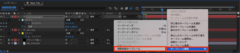 ペーストされたキーフレームを全て選択して、右クリック「キーフレーム補助」内の「時間反転キーフレーム」を選択してキーフレームを反転させます。同じ様にJohn Doeのテキストにも適用させると良いでしょう。