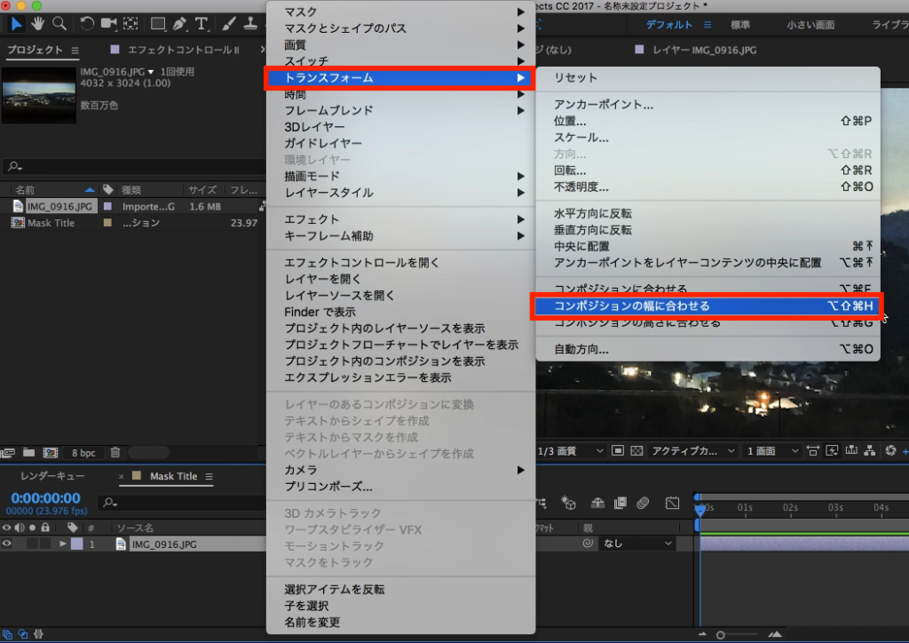 画像などコンポジションのサイズにフィットしない場合は、背景のレイヤーをタイムライン上で選択し、右クリック「トランスフォーム」から「コンポジションの幅に合わせる」をクリックするとサイズが自動で調整されます。