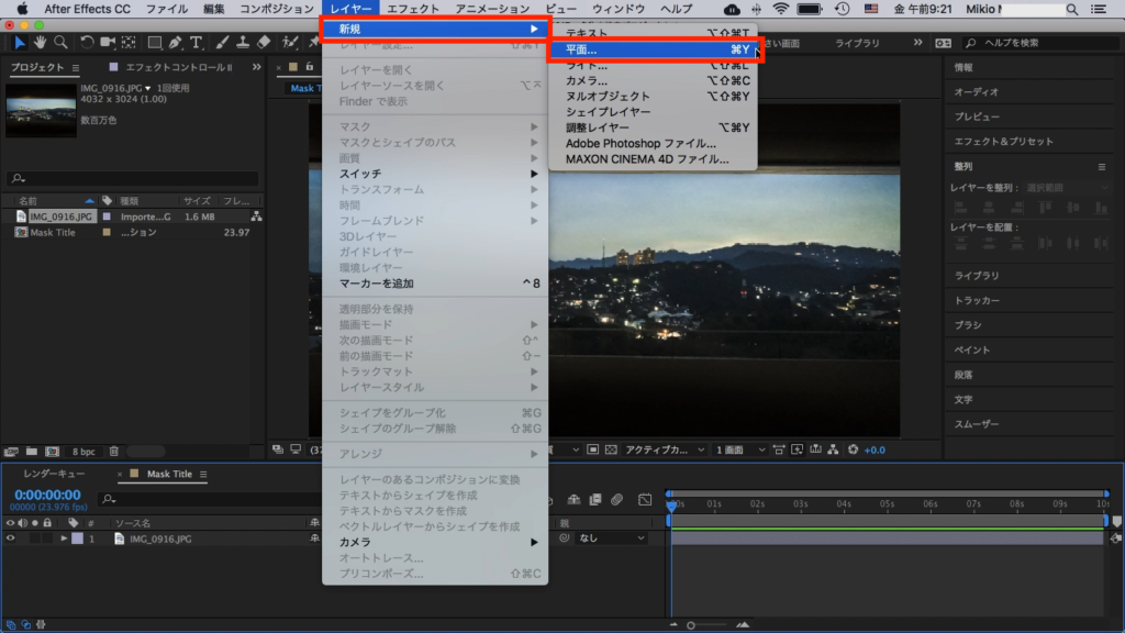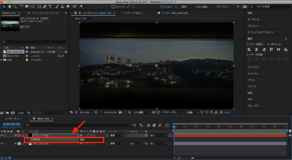 平面はコンポジションまたはタイムラインにドラッグ・アンド・ドロップし、背景画像の上に来るようにレイヤーを配置させ、面の不透明度を50%にして背景の画像が見えるようにしましょう。