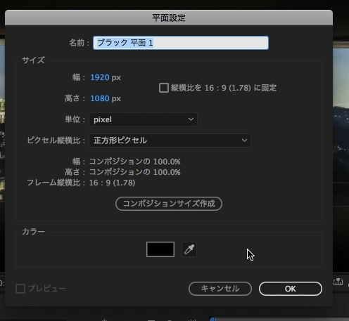コンポジション設定はひとまず、HDTV/1920x1080/23.976のデュレーションを10秒にしています。背景は何色でも構いません。