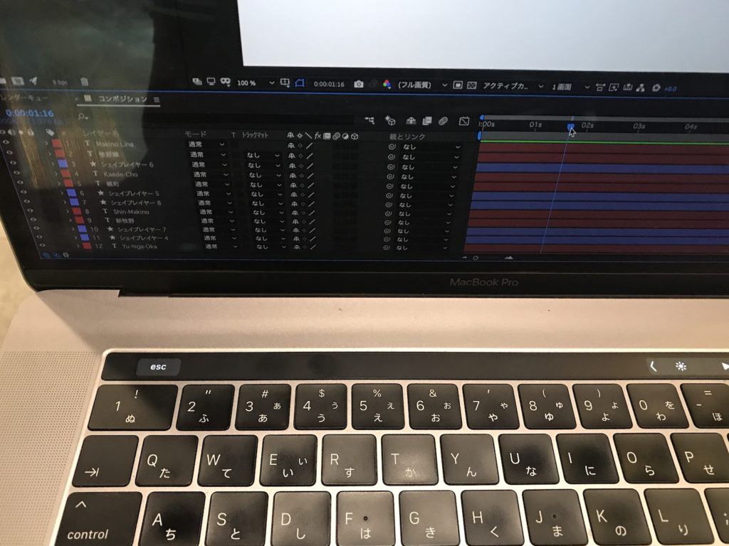 筆者がよく使うアプリの一つ、Adobe After EffectsではTouch Barがまだサポートされていない様で、アプリを開いても何も現れません。