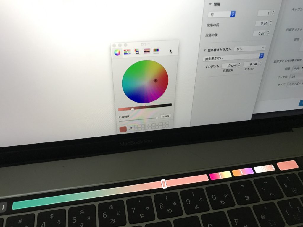 また、Pagesでは文字色をカスタマイズする際、Touch Barでスライドして色を微調整できるのですが、CMYKまたはRGBのそれぞれをスライドして調整していくので少々時間を掛けてしまいます。そのためこちらもマウスを使用してカラーパレットから好きな色を選ぶ方が早い気がします。