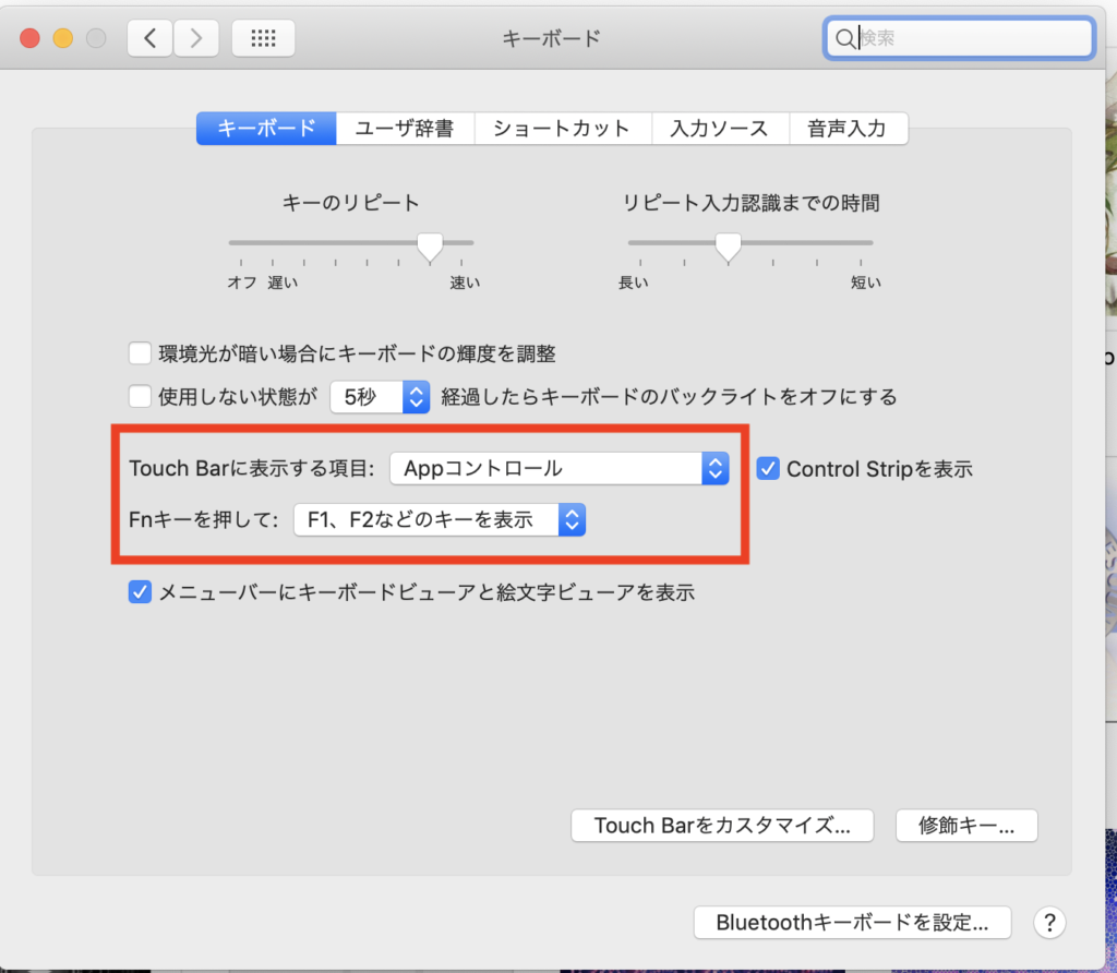 出来ればTouch Bar無いモデルと同じ様に使いたい!という方はシステム環境設定の「キーボード」より「Touch Barに表示する項目」を「Control Strip(展開した状態)」に設定すると明るさやボリュームのボタンなどが一列に表示されるようになります。