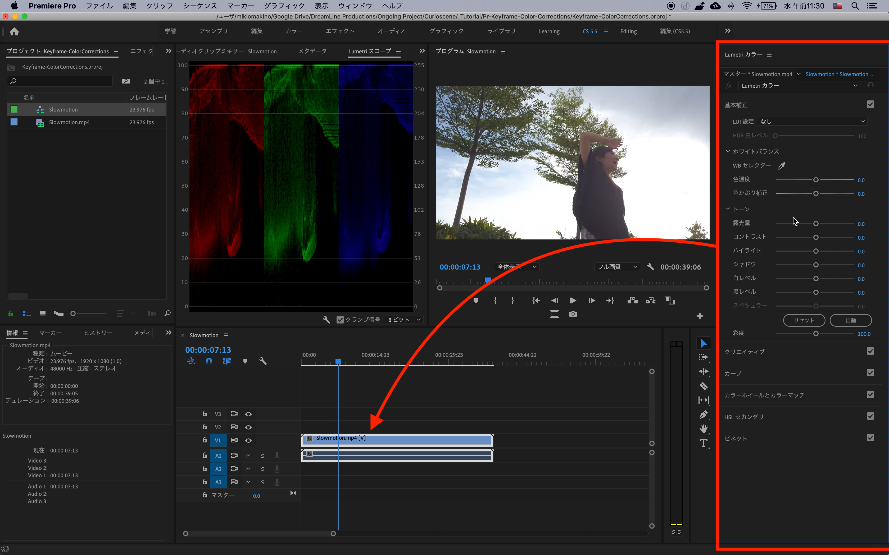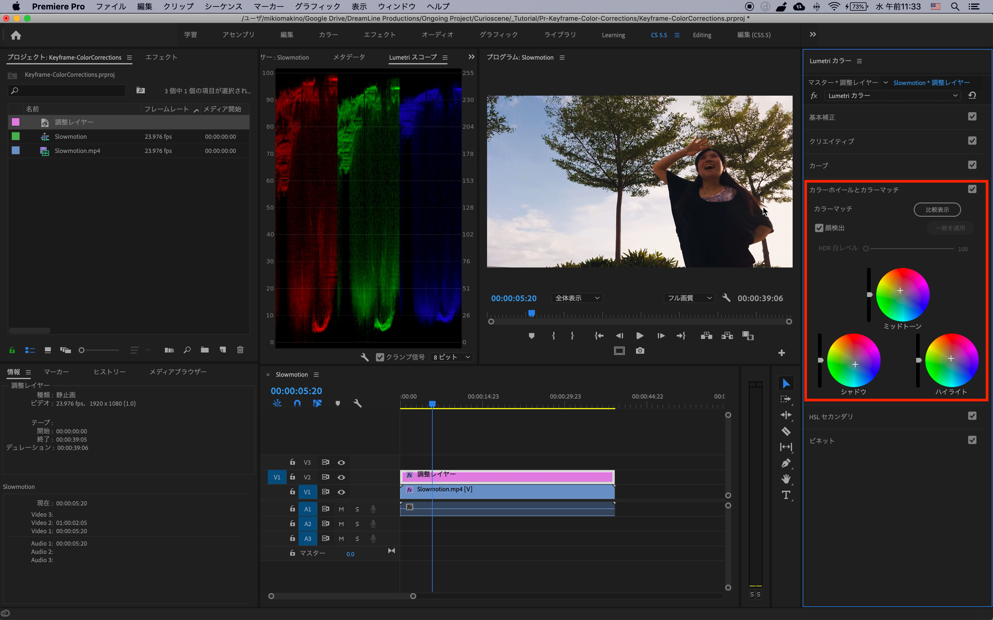 色補正関してはLumetriスコープのRGBパレードを使用すると、より細かく設定できます。