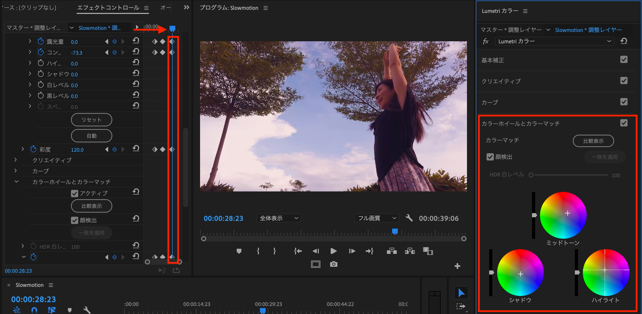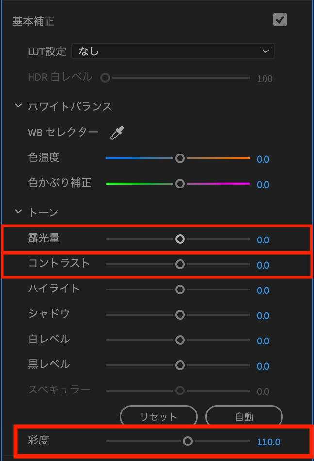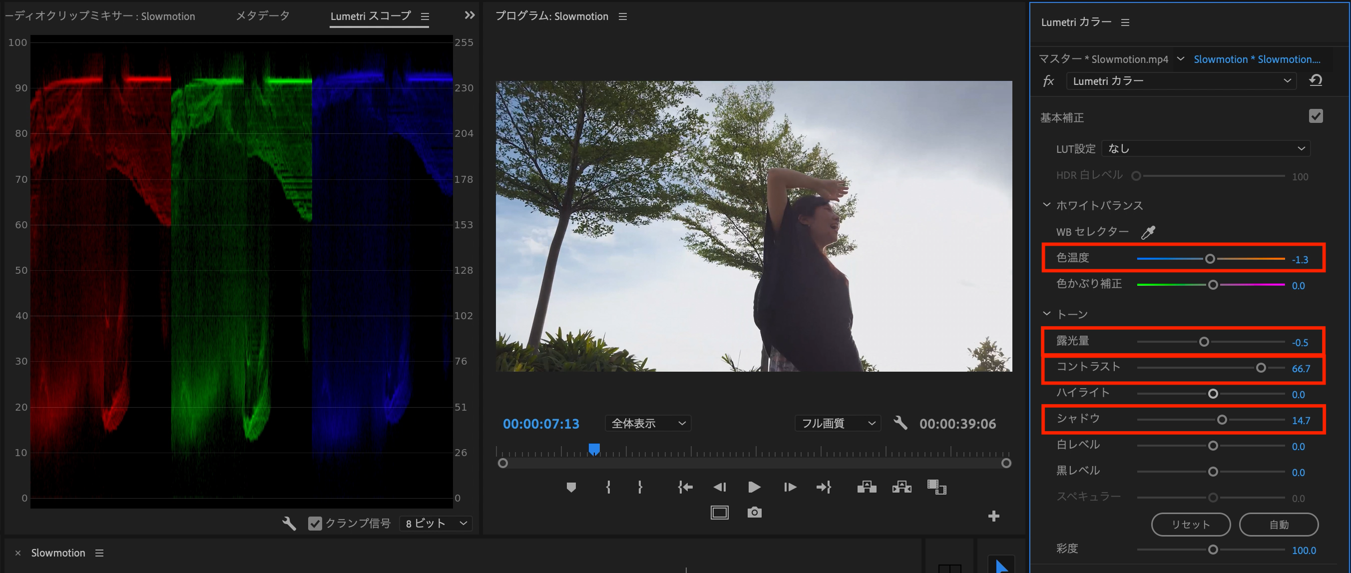 こちらのクリップでは露出オーバーしていたので、Lumetriカラーの「基本補正」内の「色温度」、「露光量」、「コントラスト」、「シャドウ」を調整しました。