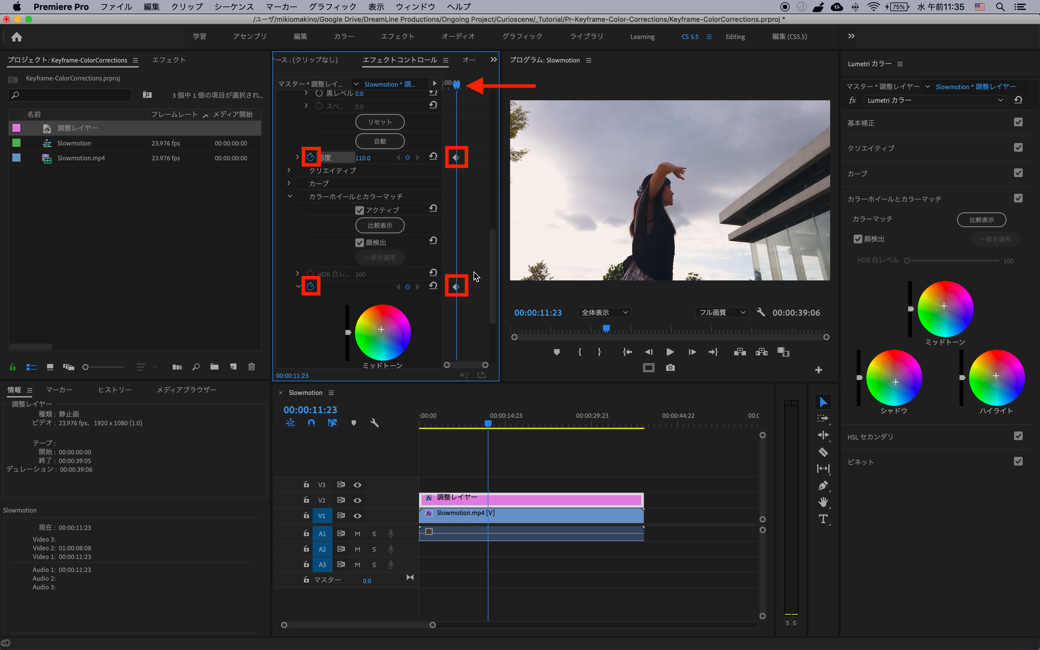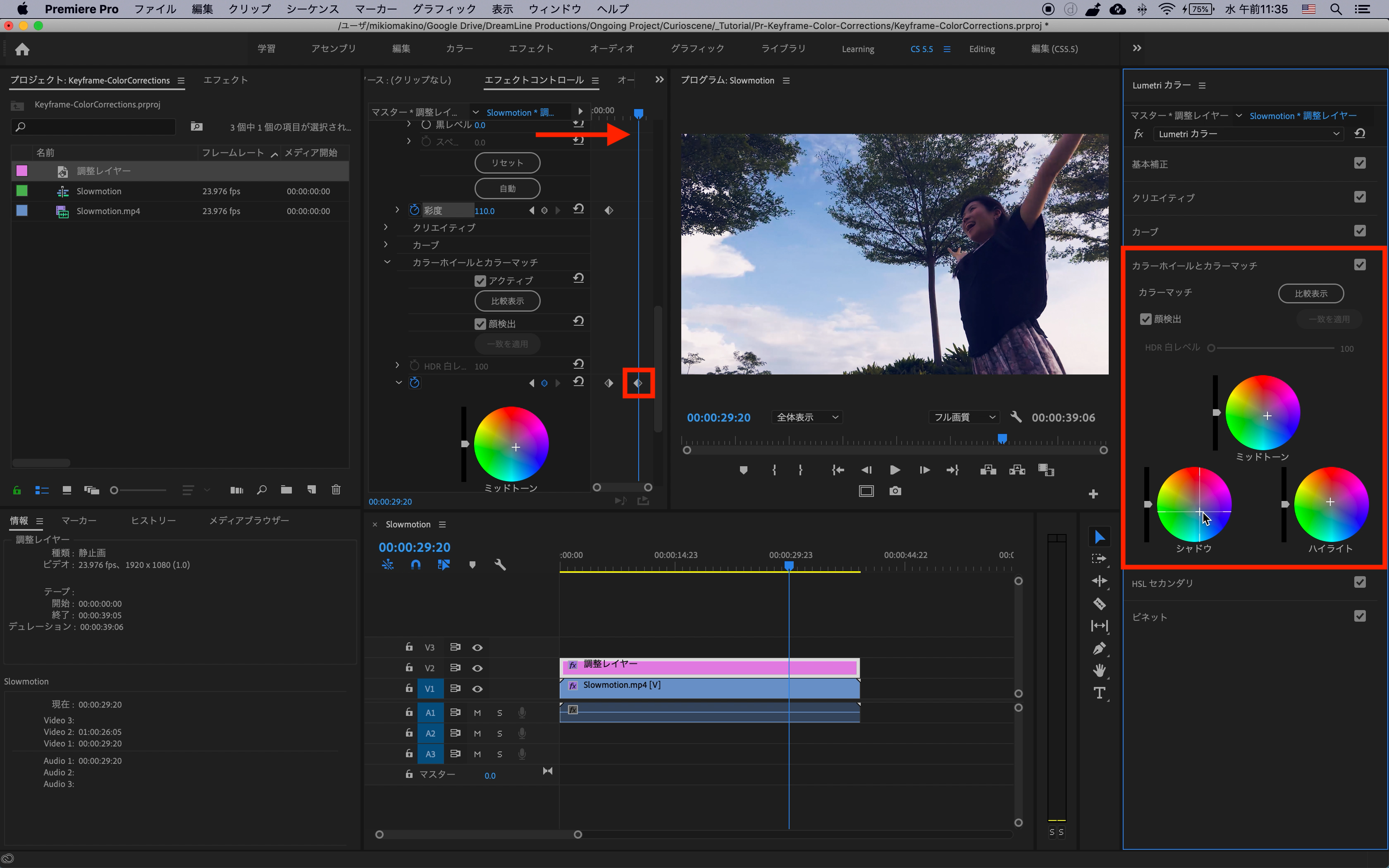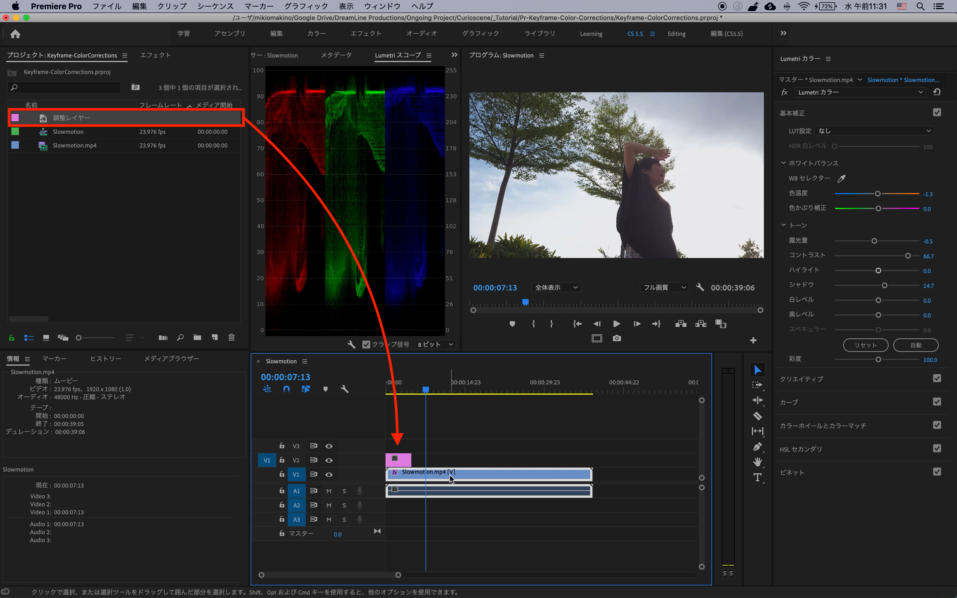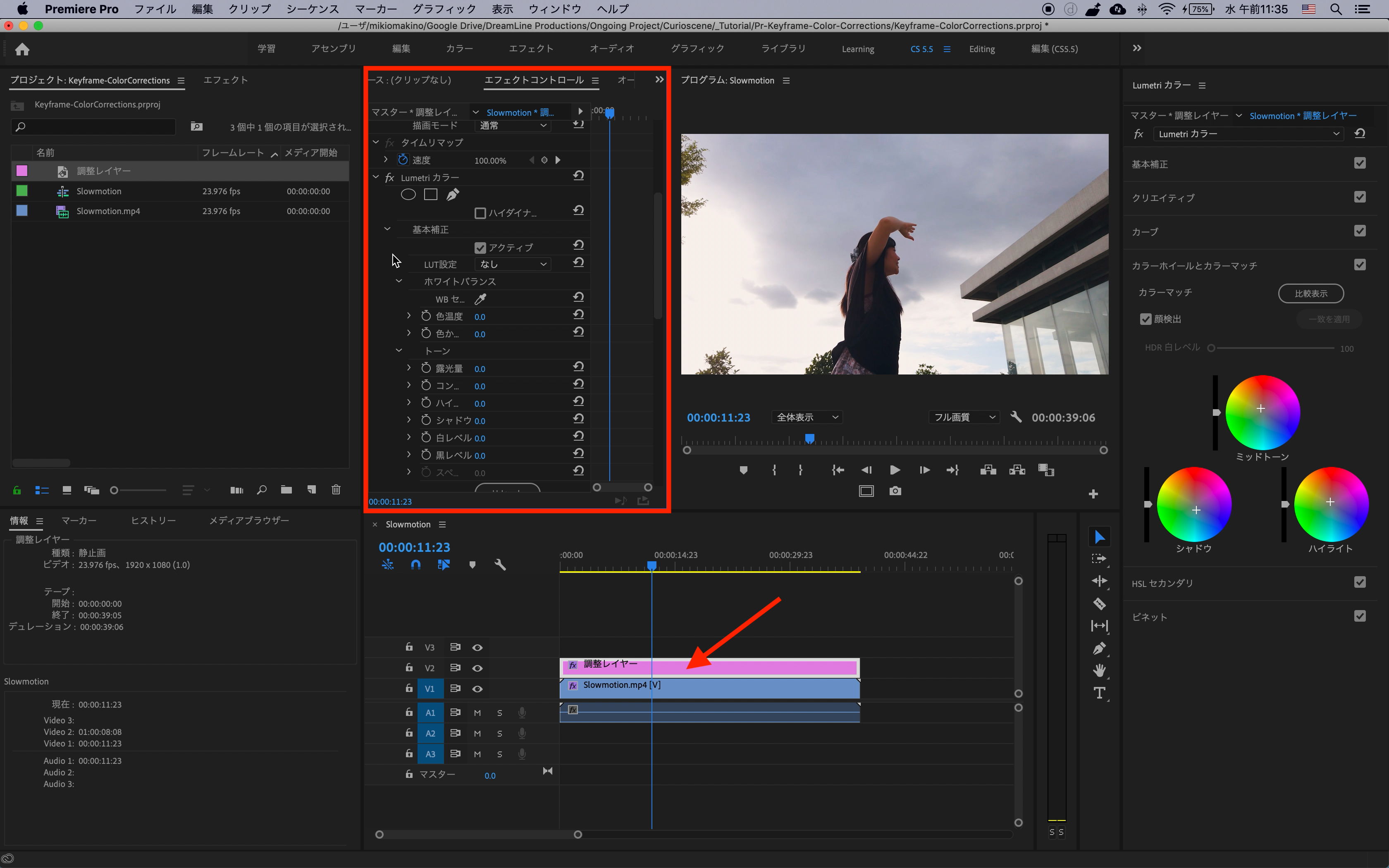 最初の色のグレーディングが完了したら、調整レイヤーを選択して「エフェクトコントロールタブ」の「Lumetriカラー」の項目を開きましょう。