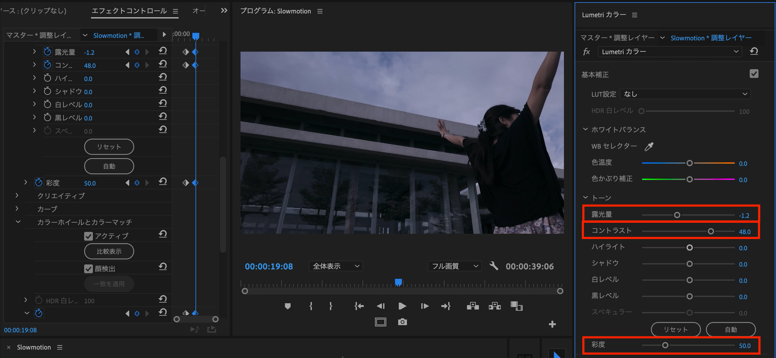 調整レイヤーを選択し、必要に応じてLumetriカラーから「基本補正」内にある「露光量」、「コントラスト」、「彩度」などの調整を行います。