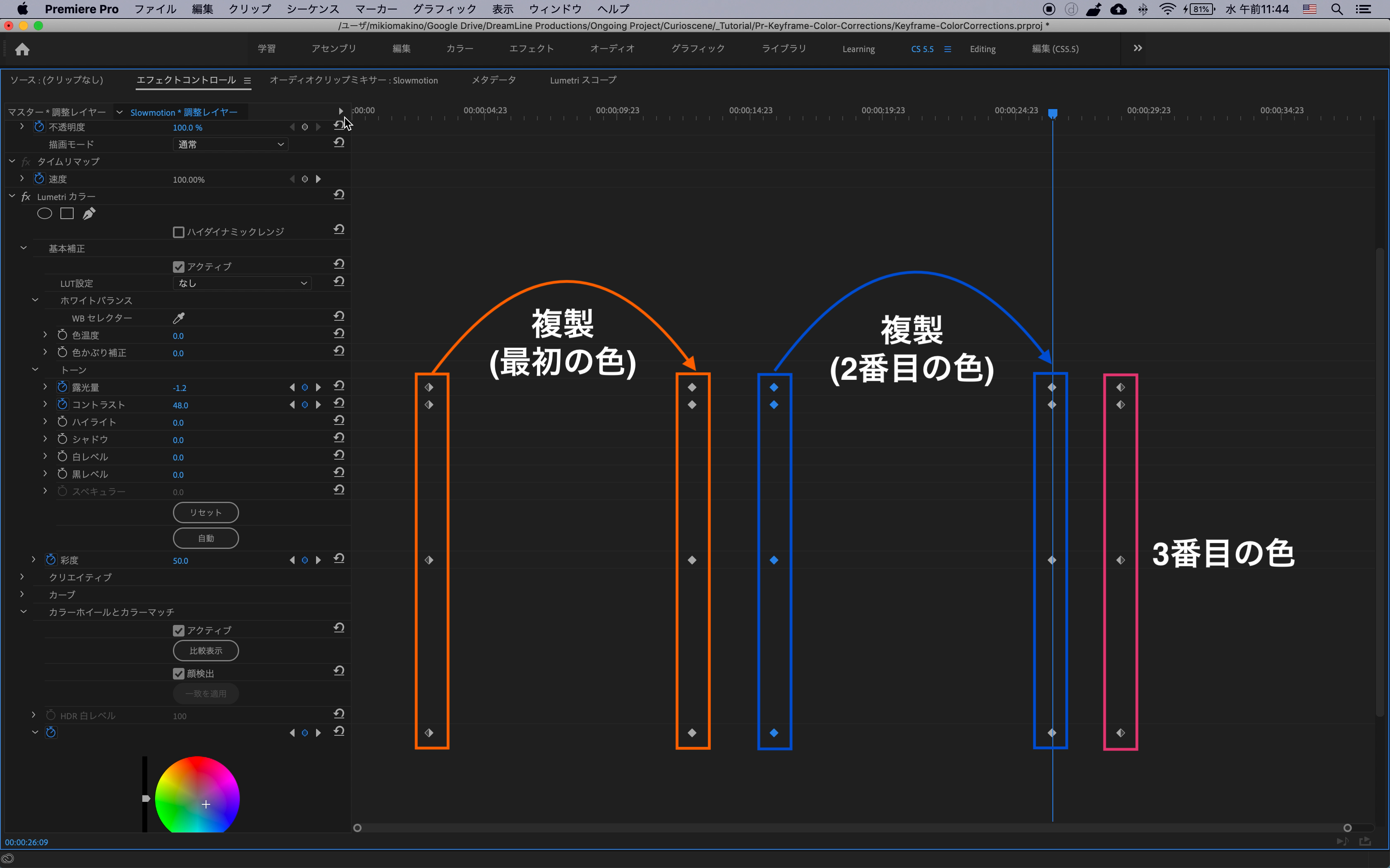 タイムインディケーターで色の変化を開始したいタイミングに持っていき、先ほど調整した「基本補正」内にある「露光量」、「コントラスト」、「彩度」と「カラーホイールとカラーマッチ」項目のストップウォッチアイコンをそれぞれクリックして現在の状態をキーフレームに追加します。
