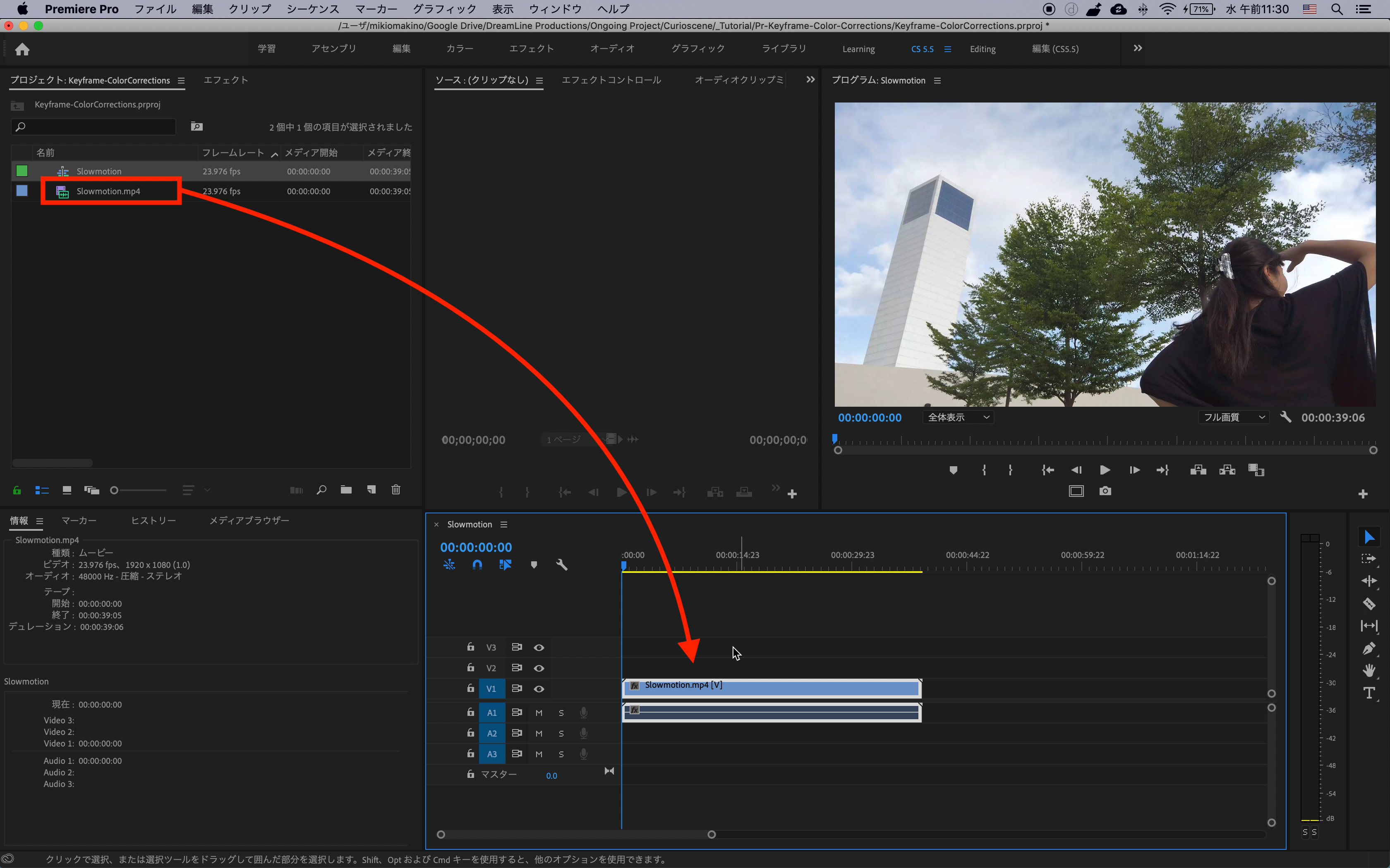 エフェクトを付け加える前にLumetriカラーを使って、クリップの色補正を行いましょう。