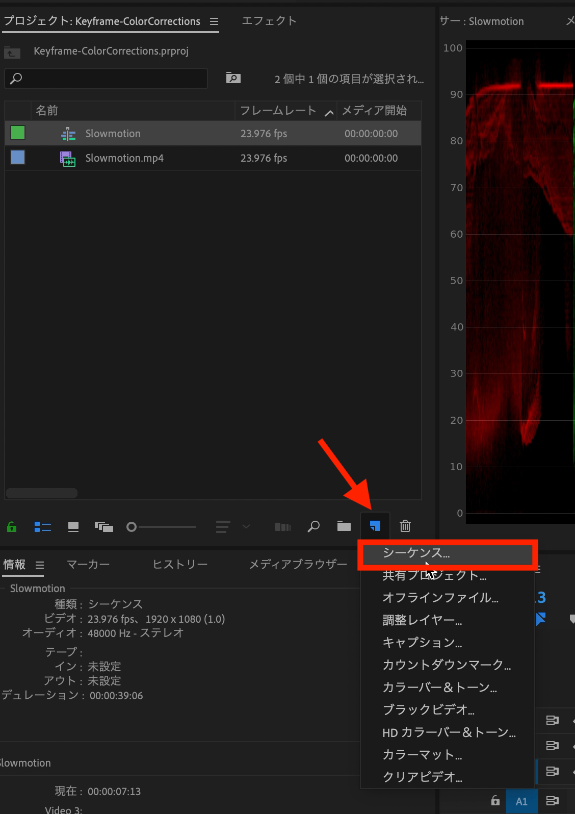 クリップをシーケンスのあるエリアにドラッグ・アンド・ドロップまたは新規シーケンスからシーケンスを作成します。