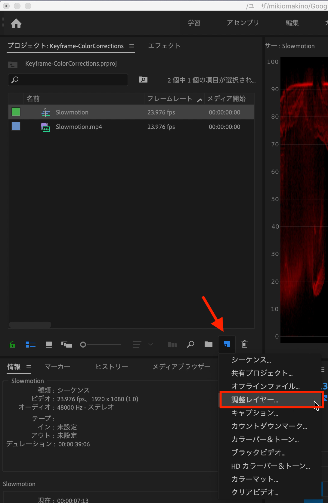 色補正が完了したら、プロジェクトウィンドウの下部にある新規アイコンから「調整レイヤー」を追加し、クリップの真上に来るように配置します。