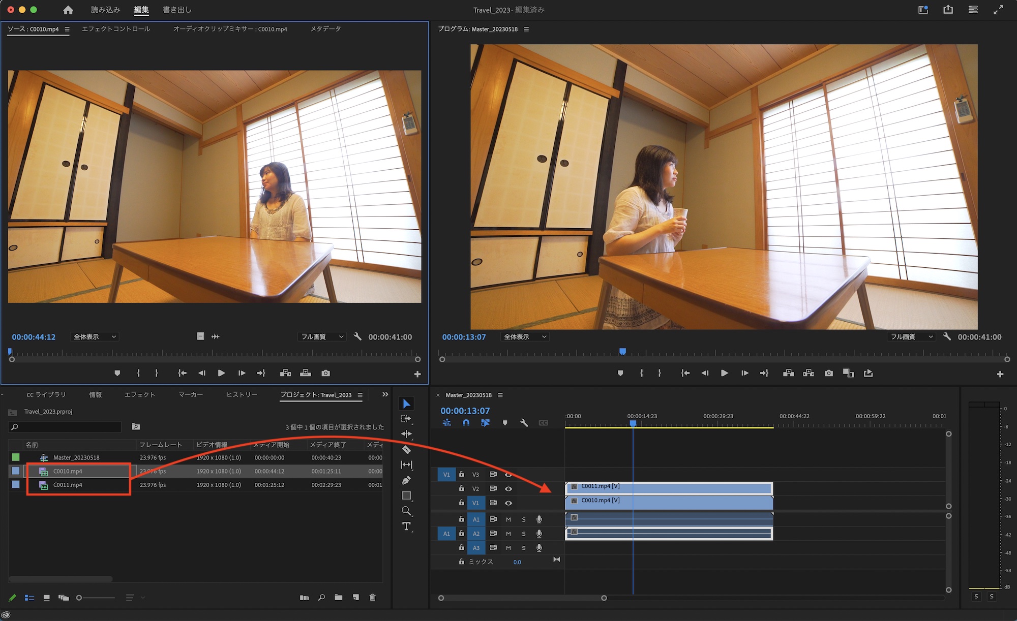 Premiere Proにクリップをシーケンスに追加し、2つのクリップをV1、V2のレイヤーに配置した後、会話シーンになるようにクリップのタイミングを揃えていきましょう。