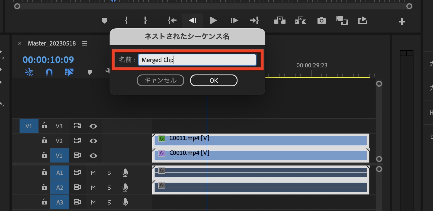 合成したクリップを全て選択し、右クリック「ネスト」をクリックし、名称を入力すればクリップが一つにまとめられます。