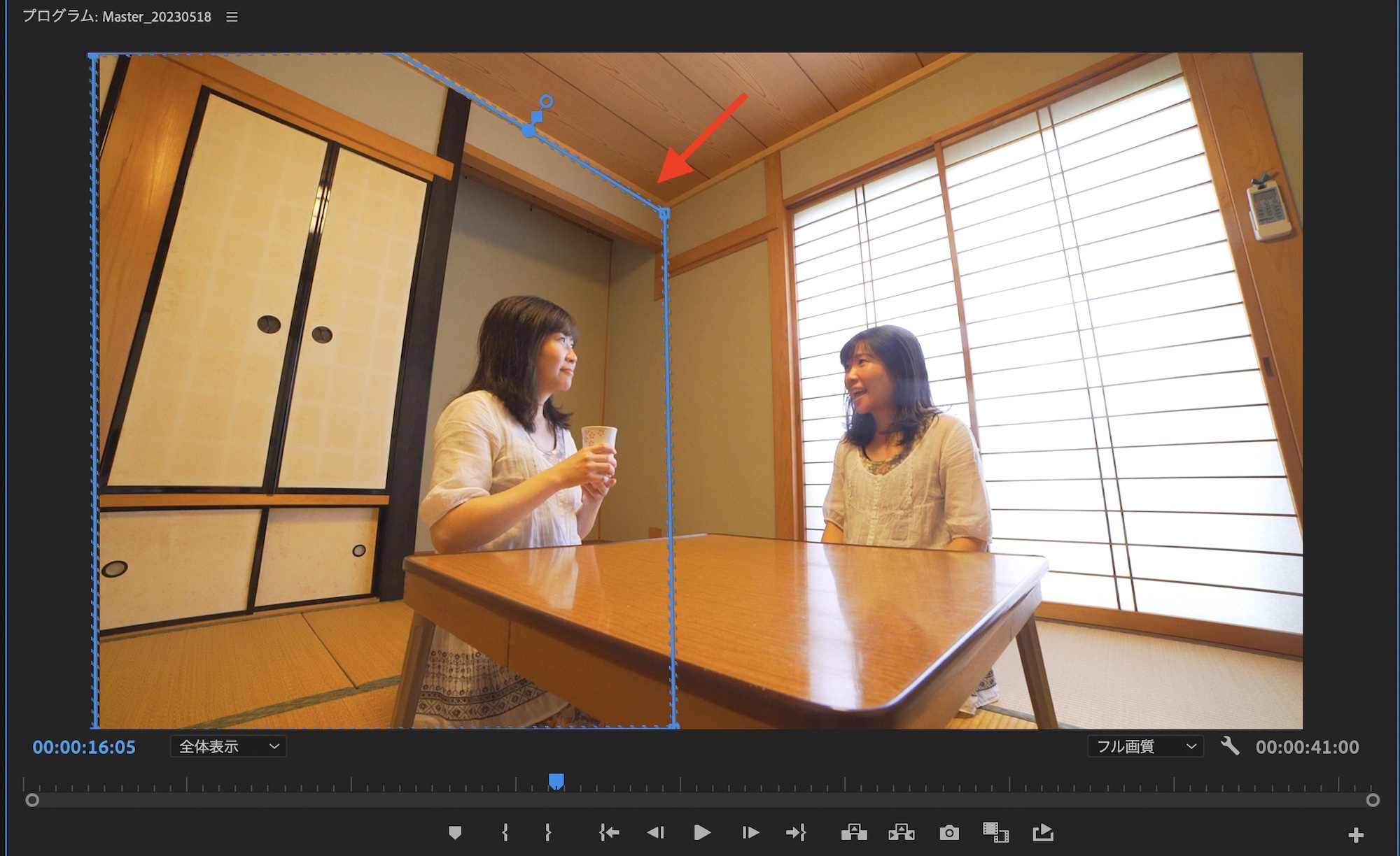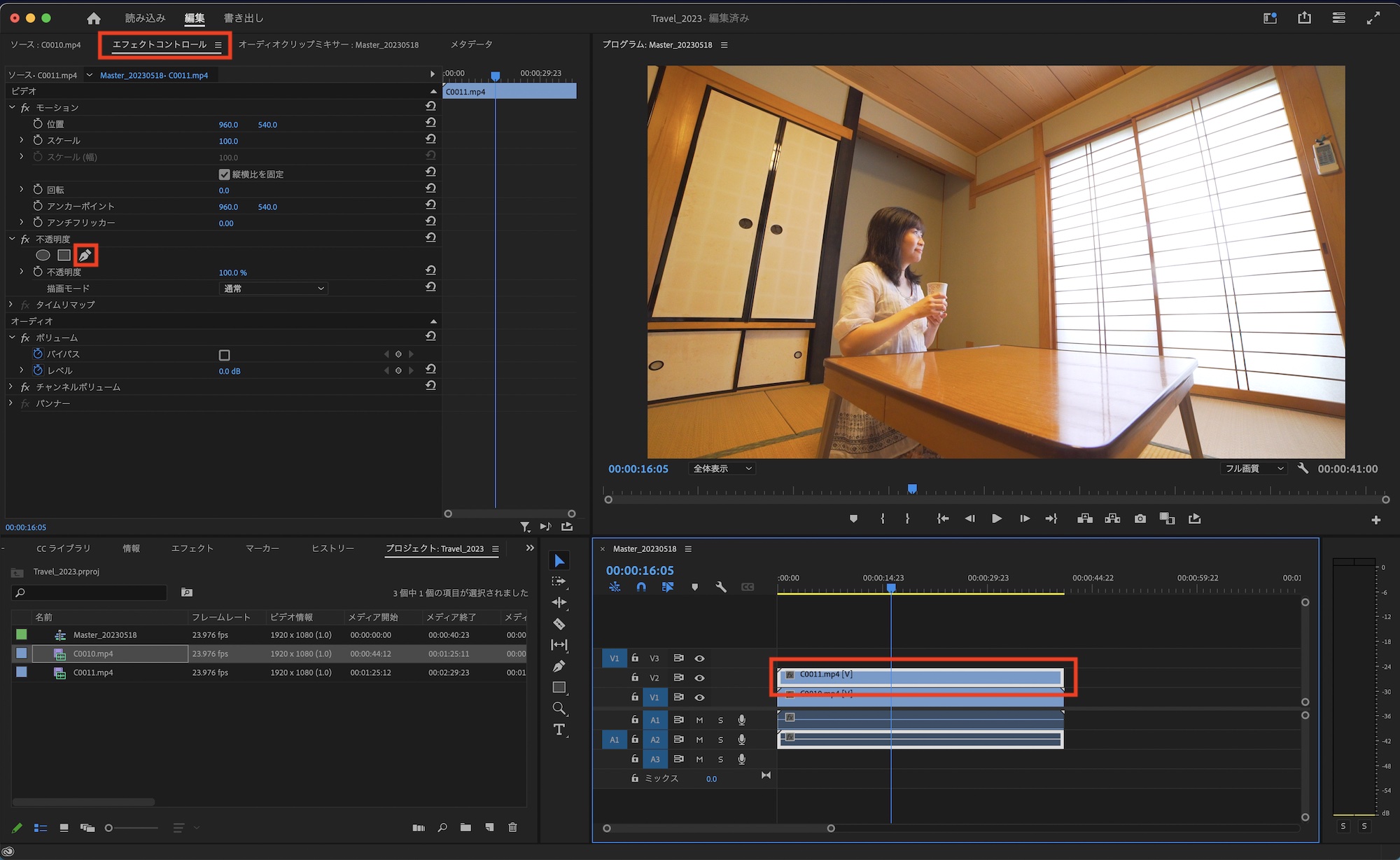 女性が左側にいるクリップがレイヤーの最上部に配置されているので、この一番上にあるレイヤーを選択し、エフェクトコントロールパネルの「不透明度」の項目のペンツールをクリックし、ペンマスクを追加します。