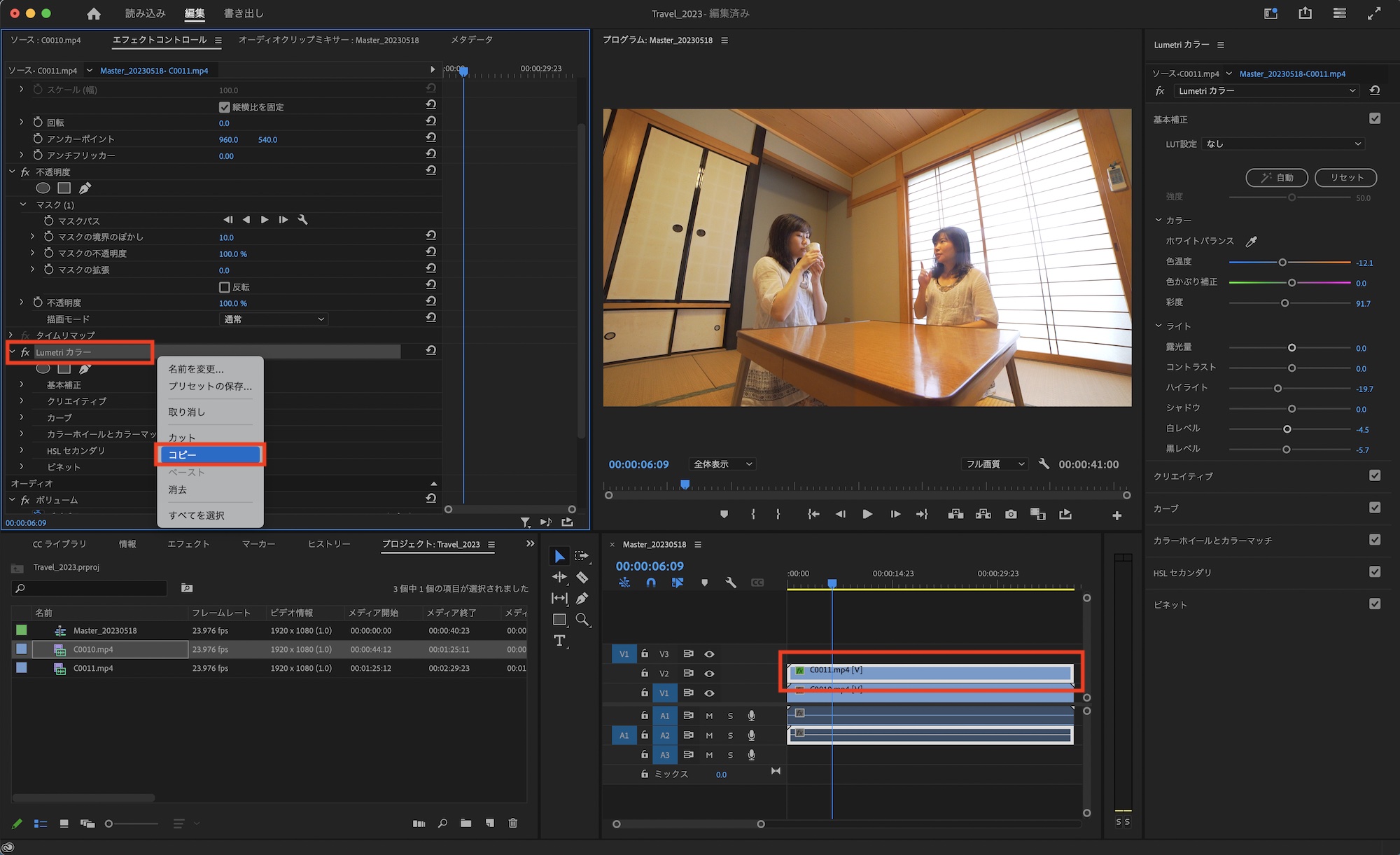 エフェクトが適用されたクリップを選択し、エフェクトコントロールパネルからコピーするエフェクトを右クリック「コピー」または「Control(Command) + C」のショートカットキーを使ってコピーしましょう。
