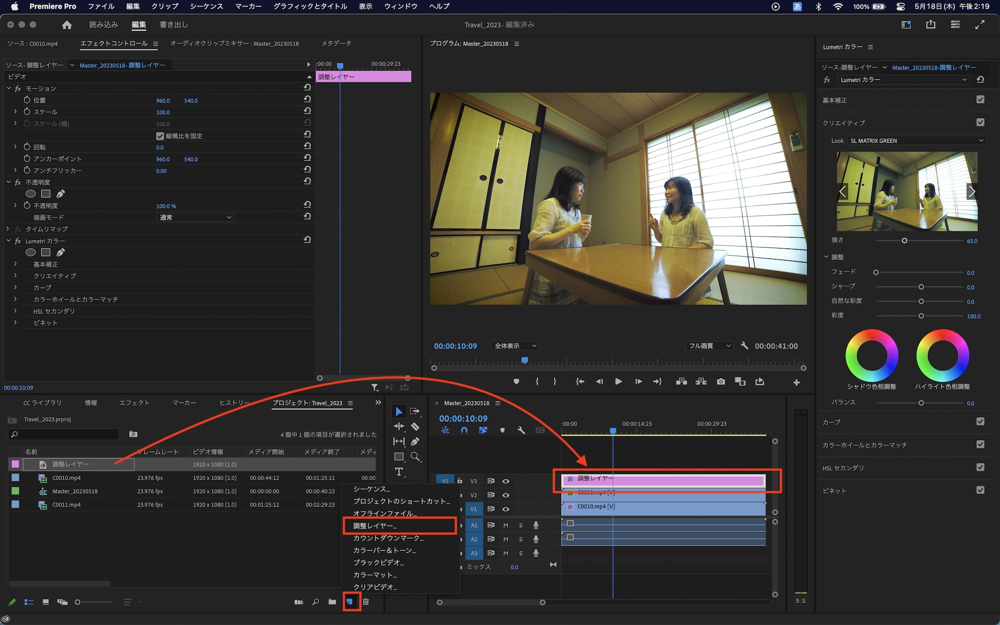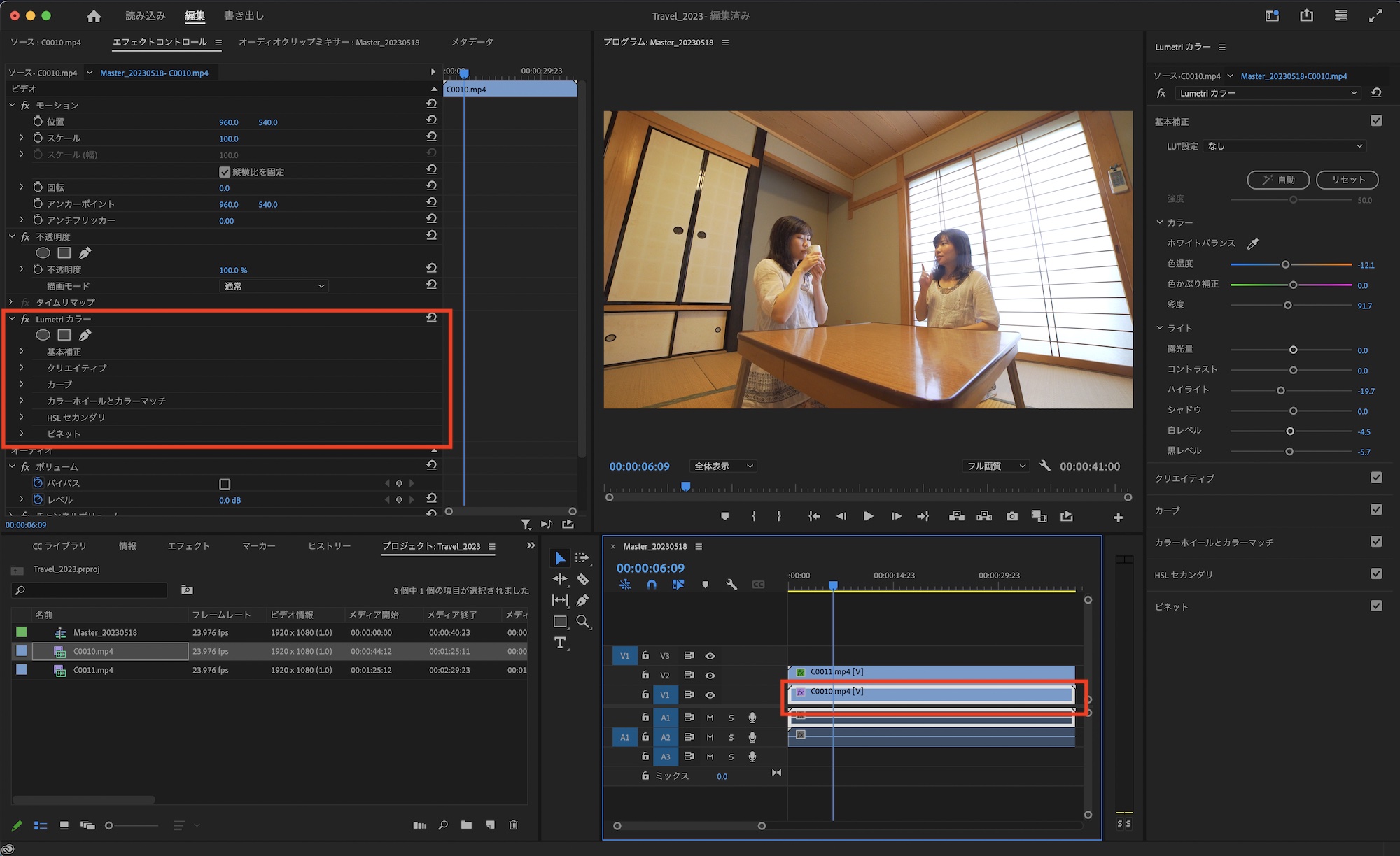 ビネットやクリエイティブLUTといったものに関しては、それぞれのクリップではなく、調整レイヤーを上部配置してそちらにエフェクトを追加するとまとめて適用できるのでおすすめです。