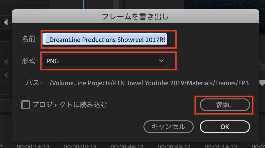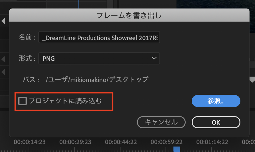 「OK」をクリックすると指定した保存先に書き出されます。「プロジェクトに読み込む」のオプションにチェックを入れると、そのままプロジェクトウィンドウに追加されるので、書き出したフレームをすぐに使用する場合はチェックを入れておくと良いでしょう。