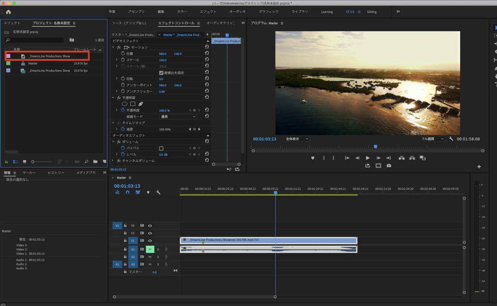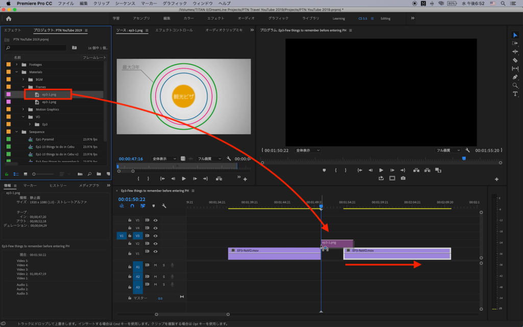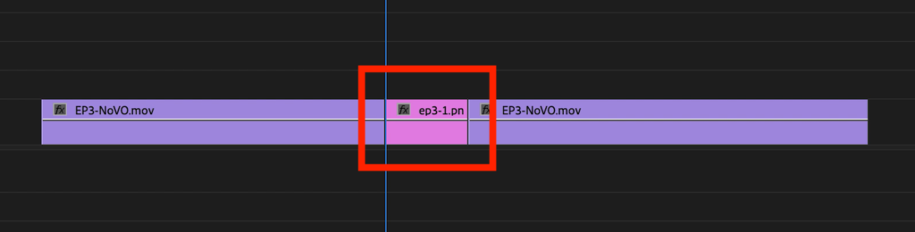 その後で書き出したフレームをシーケンスに追加。そしてフレームの長さを調整しトリムしたクリップと繋げたら、After Effectsを開かずに長さの調整を行うことが出来るようになりました。