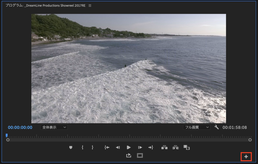 Premiere Proのデフォルトでは表示されていないと思うので、ボタンが表示されていない方はプログラムウィンドウの「+」アイコンをクリックしましょう。