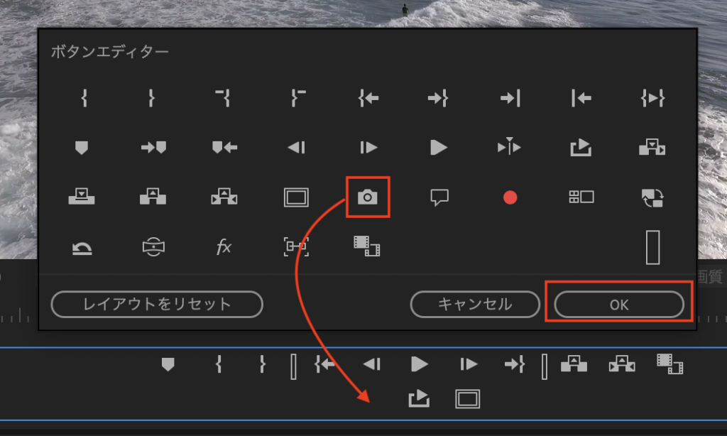 するとボタンエディタが表示されるので、その中にあるカメラアイコンをボタンエリアにドラッグ・アンド・ドロップして、表示させたい位置に配置し、「OK」をクリックします。