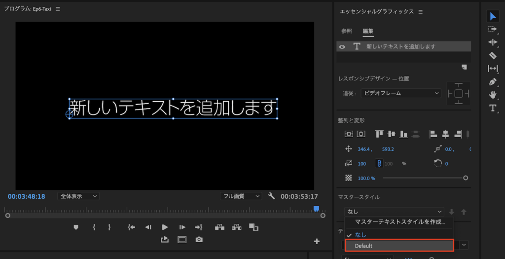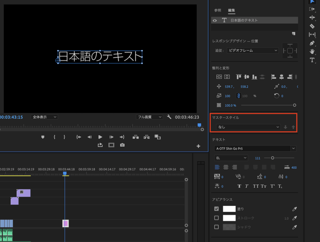 マスタースタイルはテキスト単体に設定できるテンプレートです。エッセンシャルグラフィックスにあるテンプレートとはまた独立したものになっているものの、マスタースタイルに保存されている設定は他のテキストに反映できます。