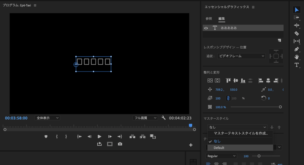 Premiere Proでは残念ながら今回のようなデフォルトのフォントを変更するオプションは無いものの、エッセンシャルグラフィックスにある「マスタースタイル(Master Style)」を使用することで、フォント一覧を開かずに一発で変更できるようになります。