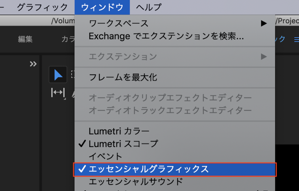 テキストを追加した後は上部から「グラフィック」を選択してワークスペースを変更するか、上部メニューの「ウィンドウ」から「エッセンシャルグラフィックス」を選択し、エッセンシャルグラフィックスのタブを表示させます。