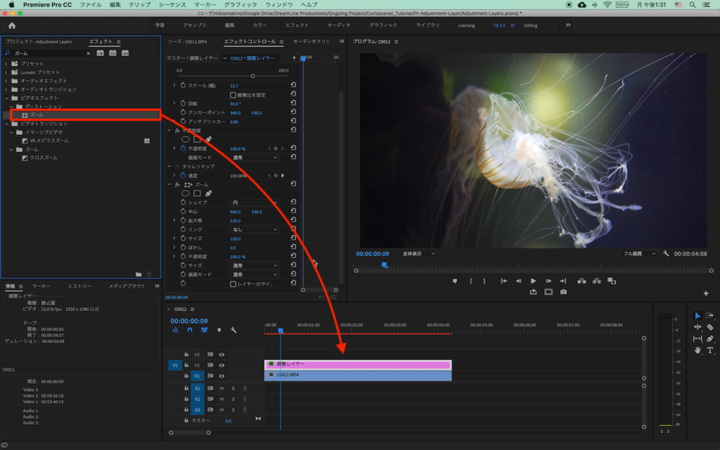 調整レイヤーにエフェクトを追加していきます。「エフェクト」タブから「ズーム」と検索して、「ビデオエフェクト」、「ディストーション」内にある「ズーム」を調整レイヤーにドラッグ・アンド・ドロップします。